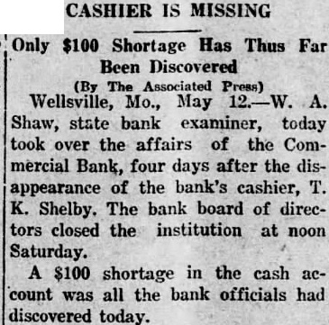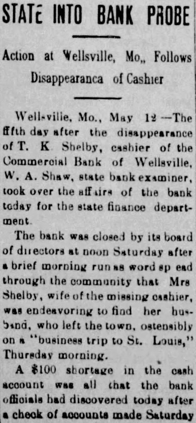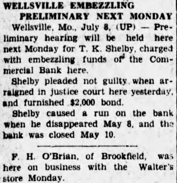 Shelby Hearing Monday. WELLSVILLE, Mo., July 8.-(U.P. Preliminary hearing will be held here next Monday for T. K. Shelby, charged with embezzling funds of the Commercial Bank here. Shelby pleaded not guilty when arraigned in justice court here yesterday, and furnished $2,000 bond. Shelby caused a run on the bank when he disappeared May 8 and the bank was closed May 10.