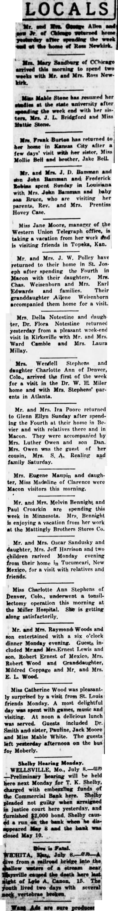 Mr. and Mrs. J. W. Polley have returned to their home in St. Joseph after spending the Fourth in Macon with their daughters, Mrs. Chas. Weisenborn and Mrs. Earl Edwards and families. Their granddaughter Ailene Weisenborn accompanied them home for a visit.