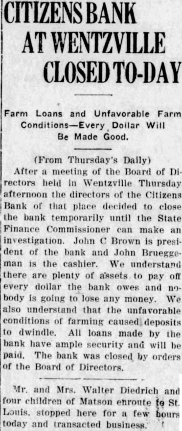The Central Trust Company of Charles was closed Monday by its Board of Directors on account of slow The bank had steady run. capital stock of $100,000, deposits and loans of $838,267. Dr. Wentker is president and Willbrand secretary of the company. Wentker depositors will Dr. says lose dollar. Frank Cullom's store in St. Charles broken into early one last week, and $500 worth ing was stolen. Bloebaum was appointed Finance Commissioner and Deputy placed in charge of the liquidation of the Citizens Bank at Wentzville. Caleb Conley Dula, the board of directors of the Liggett Myers Tobacco Company, died December 25 at his home New York at the of 66 years. City age Born in North Carolina, Mr. Dula came to Missouri as young man and with brother opened to Wentzville. At the bacco factory at of he was made manager St. Charles and his rise factory in rapid. At the to was of married Miss Julia age Womack They had no children, but Mr. Dula helped number of men and women young through college and was deeply terested in education. His estate estimated to be worth more than Hanne of Weldon Married: Lloyd Springs and Miss Martha Hayes St. Charles. Sister Annunciata of Deaths: Institute, O'Fallon; Mrs. Mary's Huncker, 91, Marion Amelia Needham, Jenkins, 46, all of St. Otto Pundmann, Charles: Robt. Moseley, of Louis, formerly of Wentzville.