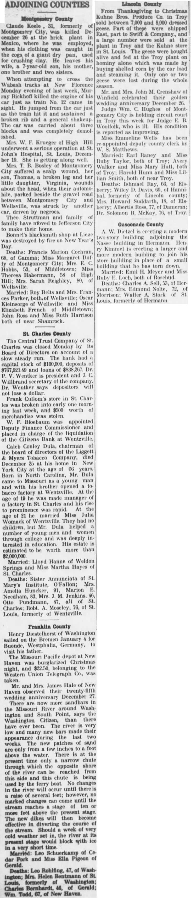 Claude formerly Montgomery City, was killed December 26 at the brick plant Mexico, where he was employed, when his clothing was caught giant dry pan, used for crushing clay. He leaves his wife, son, his mother, one brother and two sisters. When attempting to cross the Wabash tracks at New Florence Monday evening of last week, Murray Rickhoff killed the engine of his car just as train No. 12 came in sight. He jumped from the car the train hit and sustained broken rib and general shakeup. The car was carried about three blocks and was completely demolished. Mrs. Krueger of High Hill underwent serious operation at John's Hospital, St. Louis, Decem19. She is getting along well. Mrs. Bosley of Montgomery City suffered scalp wound, her Thomas, broken leg and her little daughter, Virginia, wounds about the head, when their automobile, parked beside the gravel road between Montgomery City and Wellsville, struck by another driven by negroes. Theo. Struttman and family family have mfoved to Jefferson City to make their home. Bonnel's shop at Liege was by fire on New Day. Deaths: Francis Marion of Gamma; Miss Margaret of Montgomery City; Mrs. Hobbs, 53, of Middletown: Miss Theresa Habermann, of High Hill; Mrs. Sarah Reighley, 80, Wellsville. Married: Roy Belts and Mrs. FranParker, Oscar Kleinsorge of Wellsville and Miss Elizabeth French of Middletown; John Ross and Miss Ruth Harrison both of near Shamrock.