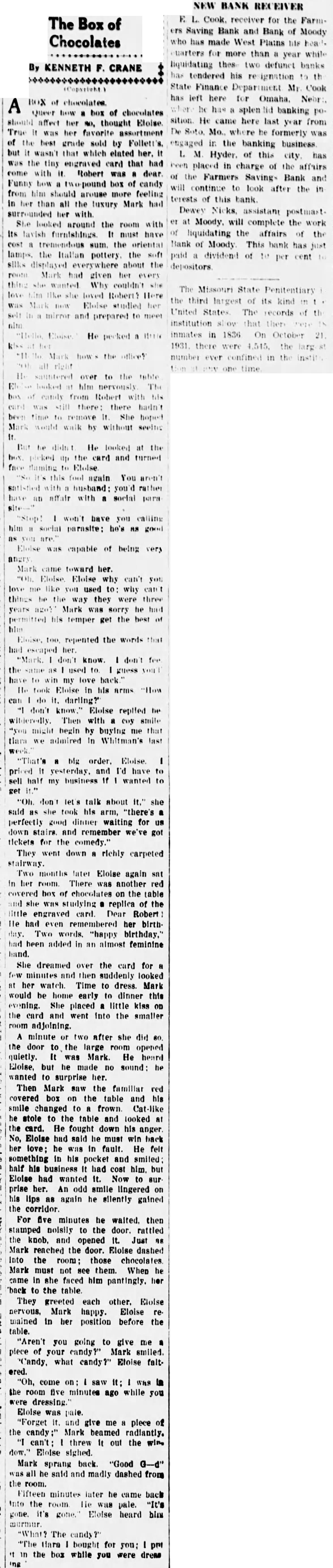 NEW BANK RECEIVER The Box of Chocolates By KENNETH F. CRANE BOX of chocolates A Queer how box of chocolates should affect her thought True It was her favorite assortment of the best grade sold by Follett's but It wasn't that which elated her, It was the tiny engraved card that had come with it Robert was dear. Funny how a two-pound box of candy from him should arouse more feeling in her than all the luxury Mark had surrounded her with She around the room with Its lavish furntshings. must have cost tremendous sum. the oriental lamps, the Italian pottery the soft silks displayed everywhere about the room Mark had given her every wanted Why couldn't love loved Robert? Here Eloise studied her self mirror and prepared to meet nim He pecked how the office? sauntered over to the table looked him nervously The box candy from Robert with this there: there hadn't been to remove It. She hoped Mark would walk by without seeing But He looked at the box. the card and turned this again You aren't husband: you rather have an with social para L. receiver for the ers Saving Bank and Bank of Moody has made West Plains his for more than a while year liquidating thes two defunct banks has tendered his th resignation State Finance Department Mr Cook has left here for Nebr:, he has splen lid banking He came here last from year De where he formerly was engaged in the banking business 1. M. Hyder. of this has been placed in charge of the affairs of the Farmers Saving- Bank and will continue to look after the in terests of this bank Dewey Nicks assistant postmast. er at Moody. will complete the work of liquidating the affairs of the Bank of This bank has just paid dividend of to cent per depositors The Missouri State Penitentiary the third largest of its kind United States The records of th institution that inmates in 1836 On October 21. there were number ever confined in won't have you calling him social parasite: he's good you Eloise was capable of being very angry Mark came toward her. Eloise Eloise why can't you love like you used to: why can't things be the way they were three years ago? Mark was sorry he had his temper get the best of him Eloise, too repented the words that had escaped her. "Mark. don't don't fee the as used to guess to my love back He took Eloise in his arms "How can do it. darling? don't know." Eloise replied he witderedly. Then with a coy smile "you might begin by buying me that tiara we admired In Whitman's last "That's big order. It yesterday. and I'd have to sell half my business If wanted to get "Oh. don't let's talk about it." she said as she took his arm, "there's a perfectly good dinner waiting for us down stairs and remember we've got tickets for the comedy. They went down A richly carpeted stairway. Two months later Eloise again sat in her room There was another red covered box of chocolates on the table and she was studying replica of the little engraved card. Dear Robert lle had remembered her birthday. Two words. "happy birthday," had been added in an almost feminine hand. She dreamed over the card for # few minutes and then suddenly looked At her watch. Time to dress. Mark would be home early to dinner this evening. She placed little kiss OD the card and went into the smaller room adjoining A minute or two after she did 80 the door to the large room opened quietly. It was Mark. He heard Eloise, but he made no sound: he wanted to surprise her. Then Mark saw the familiar red covered box on the table and his smile changed to frown Cat-like he stole to the table and looked at the card. He fought down his anger. No, Eloise had said he must win back her love; he was In fault. He felt something his pocket and smiled: half his business had cost him. but Eloise had wanted it. Now to sur prise her. An odd smile lingered on his lips as again he allently gained the For five minutes he waited. then stamped noisily to the door. rattled the knob. and opened It. Just 98 Mark reached the door. Eloise dashed Into the room; those chocolates Mark must not see them. When he came in she faced him pantingly. her back to the table. They greeted each other. Eloise nervous, Mark happy. Eloise remained in her position before the table. "Aren't you going to give me a piece of your candy?" Mark smiled. "Candy, what candy?" Eloise faltered. "Oh, come on: saw it; was is the room five minutes ago while you were dressing. Eloise was pale. "Forget It. and give me a plece of the candy Mark beamed radiantly. "I can't: threw It out the wine dow." Eloise sighed. Mark sprang back. "Good G-d" was all he said and madly dashed from the room. Fifteen minutes later he came back Into the room lie was pale. "It's gone. it's gone. Eloise heard blas "What? The candy? "The Hare bought for you: prt in the box while you were dream