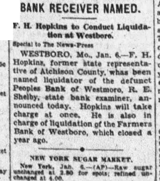 BANK RECEIVER NAMED. F. H. Hopkins to Conduct Liquidaat Westboro. Special The WESTBORO. Mo., Jan. H. Hopkins, former state representative of Atchison County. whas been named liquidator of the defunct Peoples Bank of Westmoro, R. E. Shelby, bank examiner, announced today. will charge at once. He is also in charge of liquidation the Farmers Bank of Westboro, which closed year ago. NEW YORK MARKET. New for