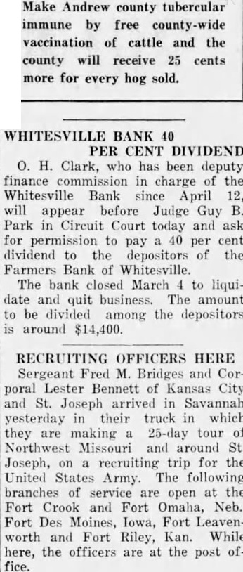 Make Andrew county tubercular immune by free vaccination of cattle and the county will receive 25 cents more for every hog sold. WHITESVILLE BANK PER CENT DIVIDEND Clark, has been deputy finance commission in charge the Whitesville Bank since April will appear before Judge Guy Park in Circuit Court today and ask for permission to pay dividend the depositors of the Farmers Bank of Whitesville. The bank closed March liquidate and quit business. The amount be among the depositors around OFFICERS HERE Sergeant Bridges poral Lester Bennett of Kansas City and St. Joseph arrived in Savannah yesterday their truck which they making 25-day tour of Northwest Missouri and around Joseph, recruiting trip for United States Army. The following branches of service are open at Fort Crook and Fort Omaha, Neb., Fort Des Moines, Iowa, Fort Leavenworth and Fort Riley, Kan. While here, the officers are at the post fice.