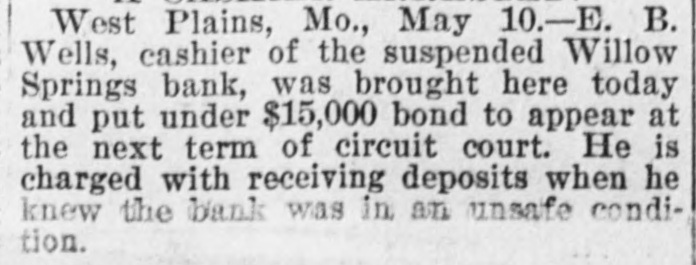 West Plains, Mo., May 10.-E. B. Wells, cashier of the suspended Willow Springs bank, was brought here today and put under $15,000 bond to appear at the next term of circuit court. He is charged with receiving deposits when he knew the bank was in an unsafe condition.