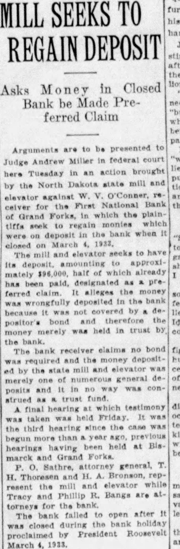 MILL SEEKS TO REGAIN DEPOSIT Asks Money in Closed Bank be Made Preferred Claim Arguments to presented Andrew Miller in federal Judge an action brought here Tuesday Dakota state mill and by the North against W. and elevator First National Bank ceiver for the of Grand which the tiffs to which in the bank when on deposit March 1933. closed on mill to have The and approxiIts half which already has designated ferred It alleges the money deposited in the bank not by and therefore the positor's merely was held in trust money the bank receiver claims no bond The and the money the and by general of merely one and It in posits strued trust fund. as which testimony final held Friday. It taken the third since the begun been held at Bishearings and Grand Sathre, general, H. and repelevator while resent the Phillip Bangs are Tracy torneys for the The bank falled open during the bank holiday was closed President Roosevelt the proclaimed March 1933.