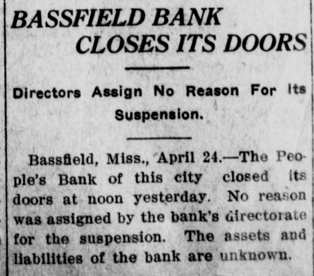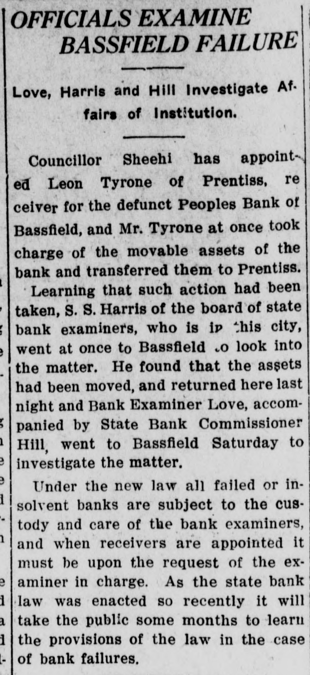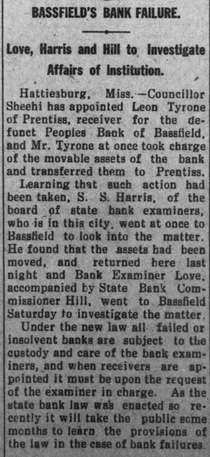 BASSFIELD'S BANK FAILURE. Love, Harris and Hill to Investigate Affairs of Institution. Hattiesburg, Miss.-Councillor Sheehi has appointed Leon Tyrone of Prentiss, receiver for the defunct Peoples Bank of Bassfield, and Mr. Tyrone at once took charge of the movable assets of the bank and transferred them to Prentiss. Learning that such action had been taken, S. S. Harris, of the board of state bank examiners, who is in this city. went at once to Bassfield to look into the matter. He found that the assets had been moved, and returned here last night and Bank Examiner Love, accompanied by State Bank Commissioner Hill, went to Bassfield Saturday to investigate the matter. Under the new law all failed or insolvent banks are subject to the custody and care of the bank examiners, and when receivers are appointed it must be upon the request of the examiner in charge. As the state bank law was enacted so recently it will take the public some months to learn the provisions of the law in the case of bank failures.