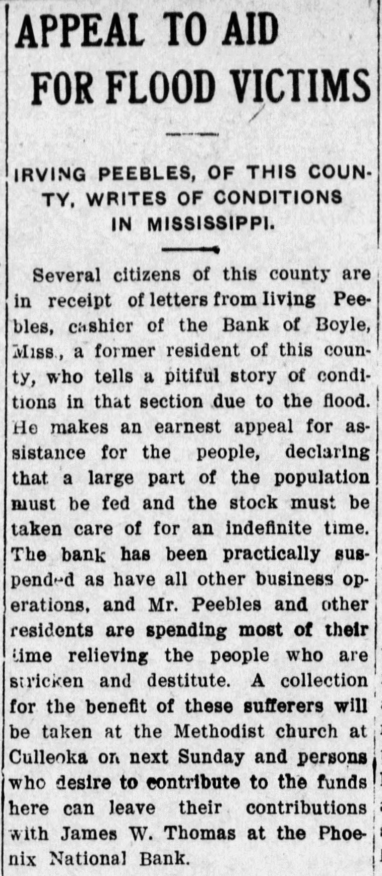 APPEAL TO AID FOR FLOOD VICTIMS IRVING PEEBLES, OF THIS COUNTY, WRITES OF CONDITIONS IN MISSISSIPPI. Several citizens of this county are in receipt of letters from living Peebles, cashier of the Bank of Boyle, Miss, a former resident of this county, who tells a pitiful story of conditions in that section due to the flood. He makes an earnest appeal for assistance for the people, declaring that a large part of the population must be fed and the stock must be taken care of for an indefinite time. The bank has been practically suspended as have all other business operations, and Mr. Peebles and other residents are spending most of their Lime relieving the people who are stricken and destitute. A collection for the benefit of these sufferers will be taken at the Methodist church at Culleoka on next Sunday and persons who desire to contribute to the funds here can leave their contributions with James W. Thomas at the Phoenix National Bank.