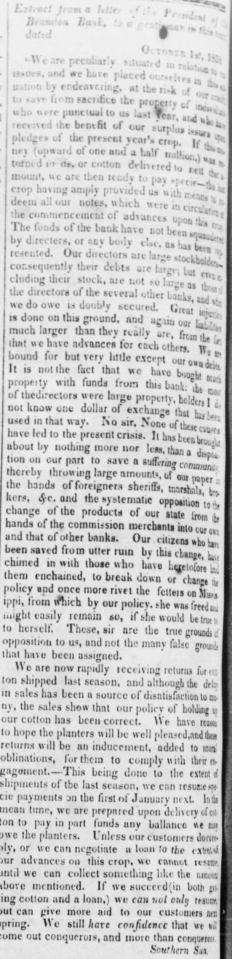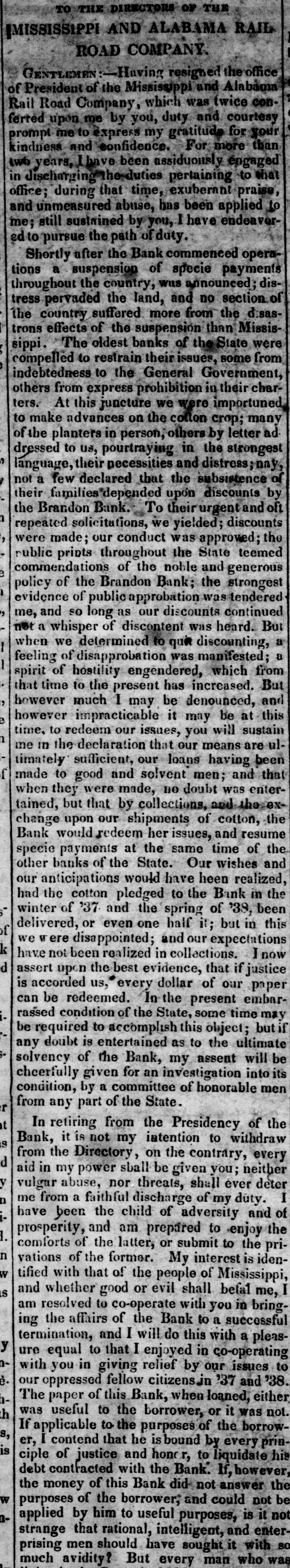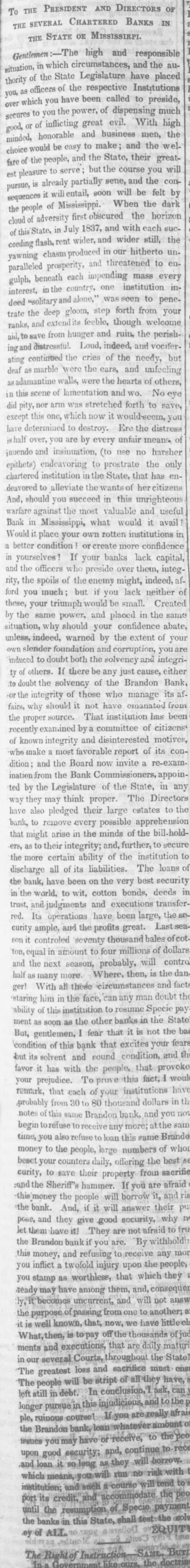 AND DIRECTORS BANKS IN OF E SEVERAL THE STATE OE Mississirpi. situation, Gentlemen THE The circumstances, high and and responsible the authority of the the respective in which State of Legislature have Institutions preside, placed you as officers have been called to much over high secures which to you you the power, great of evil. dispensing With the or of inflicting and business men, would the State, minded, choice good, honorable be easy and to make; and their the great- wel- will fare of the people, but the course you conest pleasure to serve partially sene, and be the felt by pursue, is already entail, soon will the people of first obscured the sucsequences the adversity it will Mississippi. When with each horizon dark of 1837, and the this State, in and wider cloud of rent July wider, hitherto still, unceeding flash, produced in our chasm threatened to enbeneath one paralleled impending invawning prosperity, each and institution mass every gulph, country, peneusolitary and forth from interest, deed in the gloom, alone," step was seen to welcome your trate the deep its feeble, though ranks, and hunger and ruin, save extend from Loud, indeed, and the vocifer- perish- but ing and distressful. the cries of the needy, were the ears, others, deaf ating continued marble and of unfeeling as walls, were the hearts this scene was stretched did pity, nor which now it in adamantine arm of lamentation and would-seem, forth wo. to No save, you eye to destroy. of except determined this one, Ere unfair the means distress have you are by every harsher shalf over, and insinuation, (to use no the only inuendo endeavoring to prostrate that has enepithets) institution in the State, citizens chartered deavored to alleviate succeed the wants in this of unrighteous her useful it And, should you the most valuable and avail warfare Bank in against Mississippi, what would institutions in it place your own rotten confidence Would condition ? or create more capital, better If your banks lack integin yourselves? the officers who preside over them, indeed, afrity, and the spoils of the enemy might, lack neither of much but if you small. Created ford you triumph would be in the abate, these, by the your same power, should and your placed confidence same situation, why by the extent of your doubt both the solvency unless, own slender indeed, to foundation warned and corruption, cause, and integri- you either are induced of others. If there be any just Brandon Bank, ty the solvency of the its afto doubt of those who manage emanated from or the integrity it not have been fairs, why should institution has proper source. That of citizens the examined by a committee motives, recently integrity and disinterested of its conof known most favorable report re-examwho make and a the Board now invite a appoindition; the Bank Commissioners, in any ination from the Legislature of the State, Directors ted by think proper. The estates to the way have they also may pledged their large apprehension bank, to remove every possible of the bill might arise in the minds further, to secure that their integrity; and, institution to ers, as to certain ability of the loans of security bank, bonds, discharge the more have all of been its liabilities. on the very The best deeds in the transfertrust, and judgments been large, the in the world, operations to wit, and cotton have executions Last set SOcurity thousa nd red. son it Its controled ample, and seventy the profits millions great. bales of dollars of cot`ton, equal in amount to four will contro next season, probably, is the danand the more. Where, then, and facts half as With many all these circumstances man doubt the staring ger? him in the face, can any resume Specie pay ability of this institution to banks in the State fears ment But, gentlemen, as soon as the I fear other that that excites it is not your the ba 'condition of this bank condition, and th but its solvent has with and the Found people that fact, provoke I would favor it prejudice. To proveothia institutions have your remark, that each of your dollars in th ,probably from 30 to 80 thousand and you not notes of this same Brandon bank, at the sain begin torefuse to receive any more; Brande also refuse to loan this same of who time, you to the people, large numbers best beset money your counters daily, offering from the sacrifie to save their property afraid the Sheriff's hammer. If and this the people will their and curity, money borrow answer you are it, And, if it will they give good to the pose, bank. and have it! They are security, not nfraid why fru let them withholdi the Brandon bank if you are. By any mor this money, and refusing o receive the people, inflict a twofold injury upon which they you stamp as worthless, that consequer you may have among them, and, will not answ ready uncurrent and another; known, that, now, we of ly, it becomes it the is purpose well of passing from one thousands to have little'e is to pay off the What,then, executions, that are daily matt State ments several and Courts, throughout must the ens in our loss and sacrifice have, The greatest be stript of they can still left in and The people debt. will In conclusion, I ask, to the injudicious ple, longer ruinous pursue in course? this If you whatever amount are really.8 the Brandon banky receive, to the rece may have or to issues you security; and, continue borrow, and upon loan good it so long they will which means a course run will tend to institution; and such accommodate the port credit, and payment EQUIT until the banks its the resumption in this State, of shall Specie test:the gols ALL. of the .ey of The Right Instruction SAME BUT In a