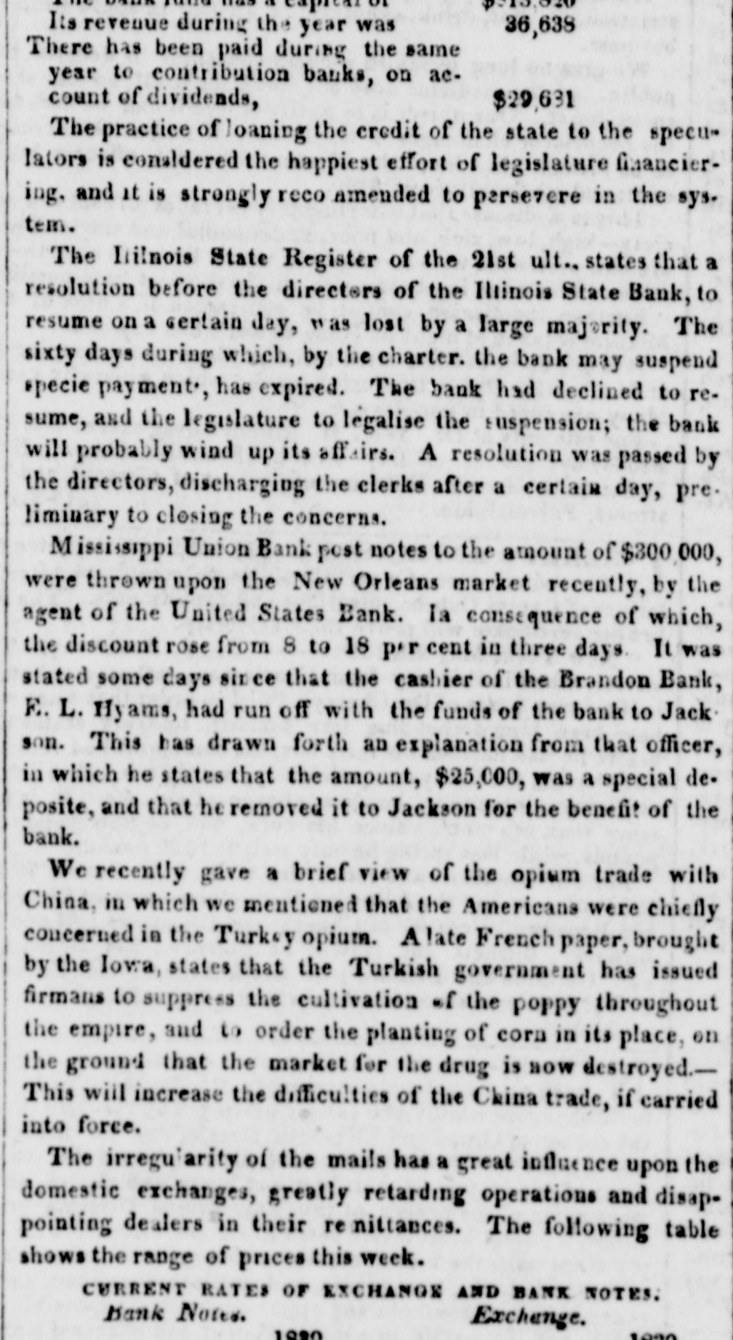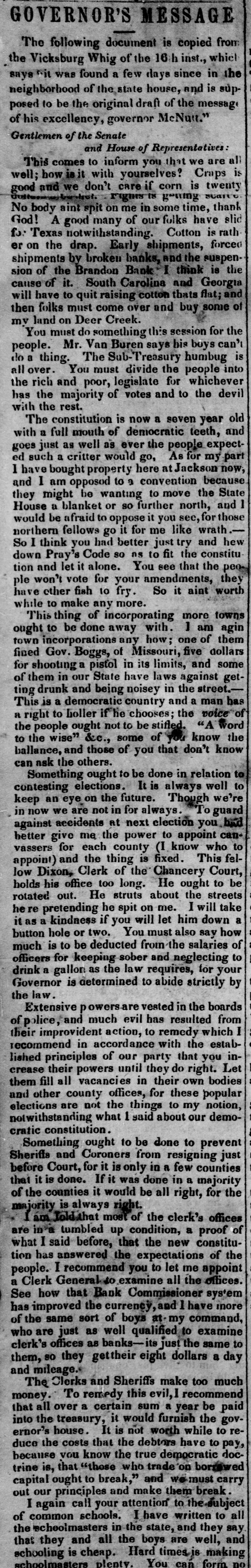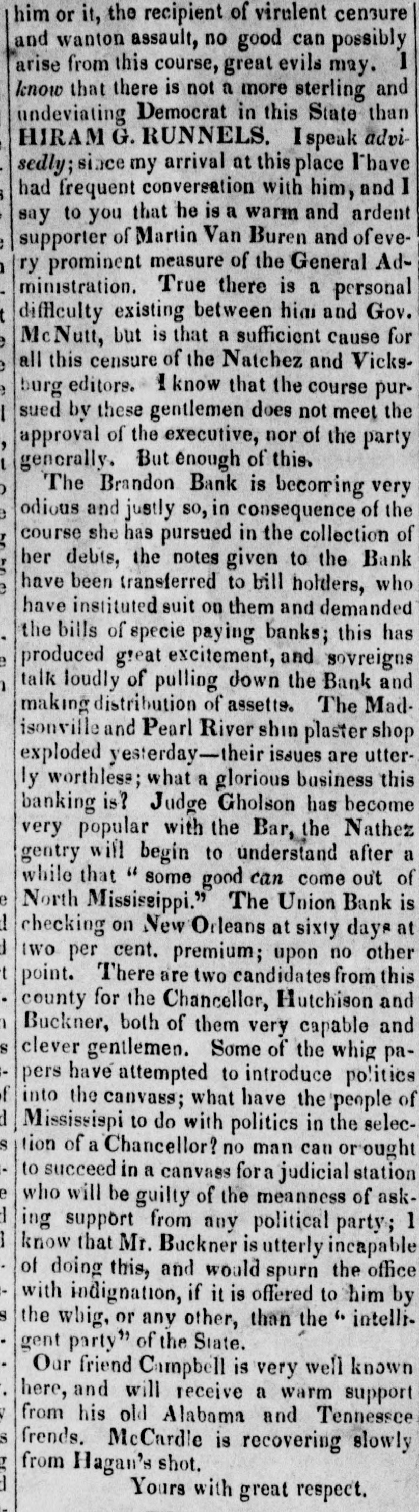 AND DIRECTORS BANKS IN OF E SEVERAL THE STATE OE Mississirpi. situation, Gentlemen THE The circumstances, high and and responsible the authority of the the respective in which State of Legislature have Institutions preside, placed you as officers have been called to much over high secures which to you you the power, great of evil. dispensing With the or of inflicting and business men, would the State, minded, choice good, honorable be easy and to make; and their the great- wel- will fare of the people, but the course you conest pleasure to serve partially sene, and be the felt by pursue, is already entail, soon will the people of first obscured the sucsequences the adversity it will Mississippi. When with each horizon dark of 1837, and the this State, in and wider cloud of rent July wider, hitherto still, unceeding flash, produced in our chasm threatened to enbeneath one paralleled impending invawning prosperity, each and institution mass every gulph, country, peneusolitary and forth from interest, deed in the gloom, alone," step was seen to welcome your trate the deep its feeble, though ranks, and hunger and ruin, save extend from Loud, indeed, and the vocifer- perish- but ing and distressful. the cries of the needy, were the ears, others, deaf ating continued marble and of unfeeling as walls, were the hearts this scene was stretched did pity, nor which now it in adamantine arm of lamentation and would-seem, forth wo. to No save, you eye to destroy. of except determined this one, Ere unfair the means distress have you are by every harsher shalf over, and insinuation, (to use no the only inuendo endeavoring to prostrate that has enepithets) institution in the State, citizens chartered deavored to alleviate succeed the wants in this of unrighteous her useful it And, should you the most valuable and avail warfare Bank in against Mississippi, what would institutions in it place your own rotten confidence Would condition ? or create more capital, better If your banks lack integin yourselves? the officers who preside over them, indeed, afrity, and the spoils of the enemy might, lack neither of much but if you small. Created ford you triumph would be in the abate, these, by the your same power, should and your placed confidence same situation, why by the extent of your doubt both the solvency unless, own slender indeed, to foundation warned and corruption, cause, and integri- you either are induced of others. If there be any just Brandon Bank, ty the solvency of the its afto doubt of those who manage emanated from or the integrity it not have been fairs, why should institution has proper source. That of citizens the examined by a committee motives, recently integrity and disinterested of its conof known most favorable report re-examwho make and a the Board now invite a appoindition; the Bank Commissioners, in any ination from the Legislature of the State, Directors ted by think proper. The estates to the way have they also may pledged their large apprehension bank, to remove every possible of the bill might arise in the minds further, to secure that their integrity; and, institution to ers, as to certain ability of the loans of security bank, bonds, discharge the more have all of been its liabilities. on the very The best deeds in the transfertrust, and judgments been large, the in the world, operations to wit, and cotton have executions Last set SOcurity thousa nd red. son it Its controled ample, and seventy the profits millions great. bales of dollars of cot`ton, equal in amount to four will contro next season, probably, is the danand the more. Where, then, and facts half as With many all these circumstances man doubt the staring ger? him in the face, can any resume Specie pay ability of this institution to banks in the State fears ment But, gentlemen, as soon as the I fear other that that excites it is not your the ba 'condition of this bank condition, and th but its solvent has with and the Found people that fact, provoke I would favor it prejudice. To proveothia institutions have your remark, that each of your dollars in th ,probably from 30 to 80 thousand and you not notes of this same Brandon bank, at the sain begin torefuse to receive any more; Brande also refuse to loan this same of who time, you to the people, large numbers best beset money your counters daily, offering from the sacrifie to save their property afraid the Sheriff's hammer. If and this the people will their and curity, money borrow answer you are it, And, if it will they give good to the pose, bank. and have it! They are security, not nfraid why fru let them withholdi the Brandon bank if you are. By any mor this money, and refusing o receive the people, inflict a twofold injury upon which they you stamp as worthless, that consequer you may have among them, and, will not answ ready uncurrent and another; known, that, now, we of ly, it becomes it the is purpose well of passing from one thousands to have little'e is to pay off the What,then, executions, that are daily matt State ments several and Courts, throughout must the ens in our loss and sacrifice have, The greatest be stript of they can still left in and The people debt. will In conclusion, I ask, to the injudicious ple, longer ruinous pursue in course? this If you whatever amount are really.8 the Brandon banky receive, to the rece may have or to issues you security; and, continue borrow, and upon loan good it so long they will which means a course run will tend to institution; and such accommodate the port credit, and payment EQUIT until the banks its the resumption in this State, of shall Specie test:the gols ALL. of the .ey of The Right Instruction SAME BUT In a