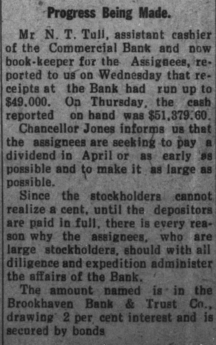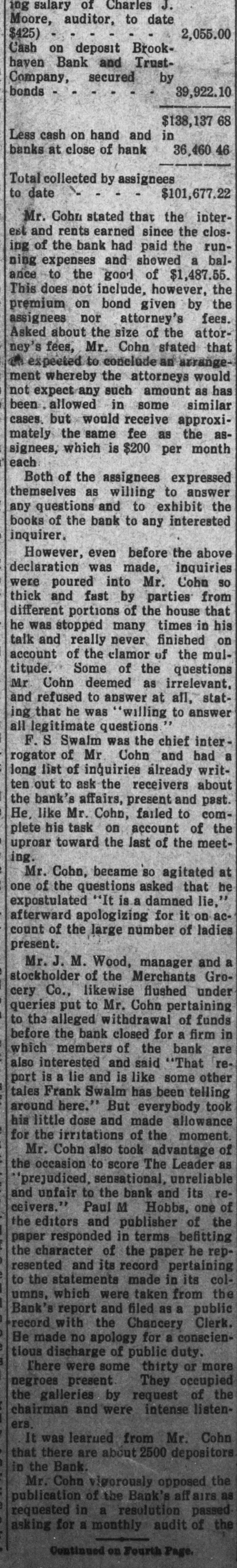 10g salary of Charles J. Moore, auditor, to date $425) 2,055.00 Cash on deposit Brookhaven Bank and TrustCompany, secured by bonds 39,922.10 $138,137 68 Less cash on hand and in banks at close of hank 36,460.46 Total collected by assignees to date L $101,677.22 Mr. Cohn stated that the interest and rents earned since the closthe bank runing of and had showed paid the balning expenses a ance to the good of $1,487.55. This does not include, however, the on the nor assignees premium bond attorney's given by fees. Asked about the size of the attorney's fees, Mr. Cohn stated that in expected to conclude an arrangement whereby the attorneys would not expect any such amount as has been allowed in some similar cases. but would receive approximately the same fee as the assignees, which is $200 per month each Both of the assignees expressed themselves as willing to answer any questions and to exhibit the books of the bank to any interested inquirer. However, even before the above declaration was made, inquiries were poured into Mr. Cohn so thick and fast by parties from different portions of the house that he was stopped many times in his talk and really never finished on of the account clamor of the multitude. Some of the questions Mr Cohn deemed as irrelevant, and refused to answer at all, statthat he was answer all legitimate ing questions." 'willing to F. S Swalm was the chief interrogator of Mr Cohn and had a long list of inquiries already written out to ask the receivers about the bank's affairs, present and past. He, like Mr. Cohn, failed to complete his task on account of the uproar toward the last of the meeting. Mr. Cohn, became so agitated at one of the questions asked that he expostulated "It is a damned lie," afterward apologizing for it on account of the large number of ladies present. Mr. M. Wood, manager and a stockholder of the Merchants Grocery Co., likewise flushed under queries put to Mr. Cohn pertaining to the alleged withdrawal of funds before the bank closed for a firm in which members of the bank are also reis a lie some port interested and and is like said "That other tales Frank Swalm has been telling around here." But everybody took his little dose and made allowance for the irritations of the moment. Mr. Cohn also took advantage of the occasion to score The Leader as "prejudiced, sensational, unreliable and unfair to the bank and its receivers." Paul M Hobbs, one of the editors and publisher of the paper responded in terms befitting the character of the paper he represented and its record pertaining to the statements made in its columns, which were taken from the Bank's report and filed as a public record with the Chancery Clerk. Be made no apology for a conscientious discharge of public duty. l'here were some thirty or more negroes present They occupied the galleries by request of the chairman and were intense listeners. It was learned from Mr. Cohn that there are about 2500 depositors in the Bank. Mr. Cohn vigorously opposed the publication of the Bank's affairs as requested in a resolution passed asking for a monthly audit of the Continued on Fourth Page,