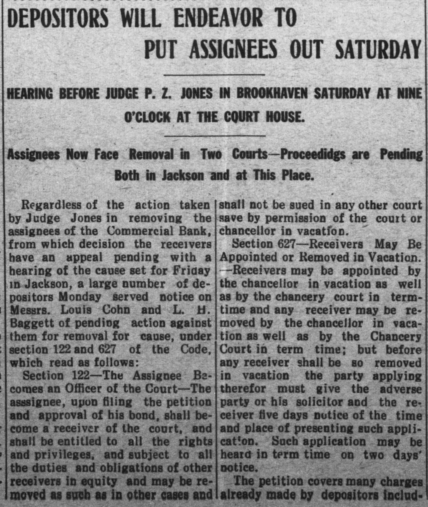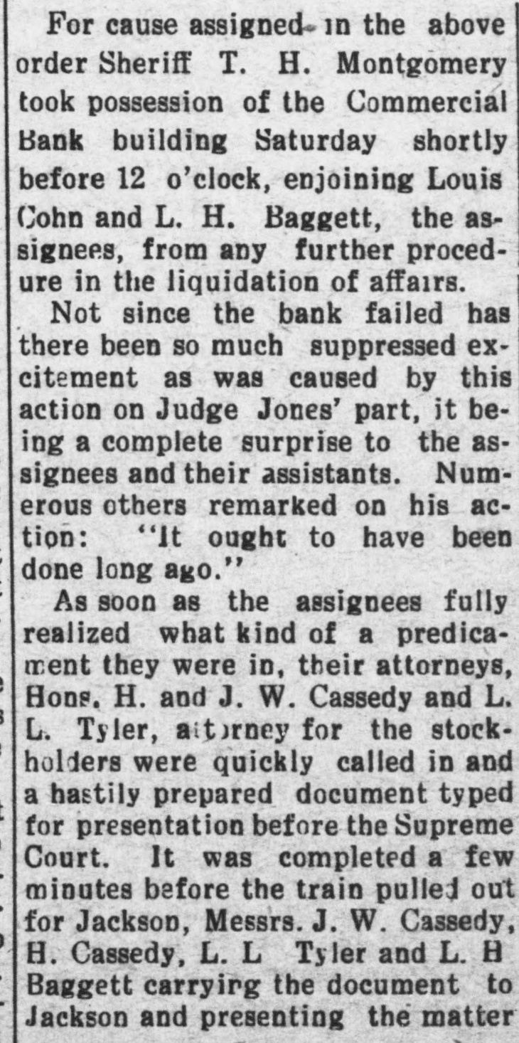 of examination. The thrills evidence to the brought many opened the spectators both and further how the bank eyes as to closed. public's managed bofore it ASSIGNEE was COHN HAD A GUN. During the trial of against the case Louis an affidavit was made for one of the assignees, UpCohn, concealed weapons. within carrying from his seat pistol, on arising bar it was seen that his was the in his hip pocket, the carried exposed to view by and as dis- he fully of his coat, Judge the shoulder Wilson, of Julian arrangement leaned over Memphis, witnessed of talk- by a him, it was spectaing to of ladies and other by number affidavit followed Ed Smith who after the the When Mr Cohn Constable tors. warrant An Judge's appeared served de- 10 cision. Justice R. S Butler a at plea before Monday he entered fined of o'clock nolle conten dere and was $100 and costs. WANT NEW RECEIVER. petition by depositors has been A asking Judge Jones to appoint August filed receiver Saturday. County 8, a new at 6 p. m. at the Lincoln court house. SOME OF THE TESTIMONY. Extracts from various portions as of the testimony are given follows: CLOSING OF THE BANK With reference to the closing of bank, Mr. Wildberger said: the 'Mr. Baggett, in conversation me in the bank accounting after with possibly three weeks my room. first came and entered on the I over there, referred to bank. duties matter of the closing of the at He said that he was sitting desk, which is out in the front draw his of the accounting room, gentlepart up some papers for a some ing who was going to sell enman and that while he was gaged land, in this particular transac- Mr. tion of drawing these papers, him F.F. Becker, cashier, came to desk leaned over the end of his statand which he was writing, and at that there would be a directors' it ed meeting at the bank that night, and being Saturday he explained, they that he could not recall when had had a meeting on Saturday what night, and could not imagine of the purport or the import went was that meeting; that when he supper. he discussed the matter to with his wife, and he couldn't fathom why it was that they were going to meet. But at the ap- the pointed hour, he went to where Drectors' Room of the bank He the meeting was in progress. said that it was discussed pro and difor some time among the con rectors of the bank, and that he stand- was the only man that insisted on that by the Commercial Bank: ing other man in the directors' meeting every was in favor of quitting that that he explained to them the there were moneyed men on Board and connected with the directorate of the bank. and that he favor of putting their shoulthe wheel and ders was in to tiding he over the the situation, and that was only one in the meeting that took that view, but that everybody else was against him " The question of over-drafts, loans, etc.) was thoroughly gone into by Mr. Brady. MR. TULL SAYS BOOKS WERE NOT AUDITED. The testimony of Mr. N. T. Tull, that assistant cashier, developed the books of the bank were not audited for 1913. With regard to the approximate W ithdrawal of $800 made by Mr. he Tall the day the bank closed, said: I'll have to offer some conexplanation of siderable Well, it. the It was withdrawal of $763 of a that I of the certificate treasurer assigned First Baptist to the Church to pay my unexpired subof $1,000 to to go into that to scription want that show church. why money. On bank closed on fore drew the my Sunday Monday to be- the was out semi-annual payday I put my check on that for my payday church. $125, semi-annual morning in ment, and on Monday proceeded to take that certificate of out, which was due on the first January and assign as say before