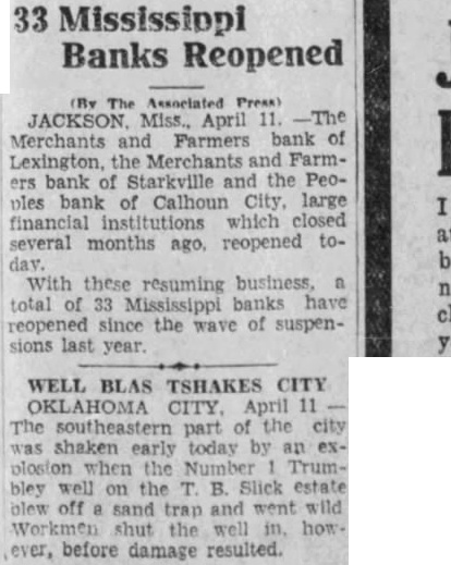 33 Mississippi Banks Reopened The Associated Press) JACKSON. Miss., April 11. -The Merchants and Farmers bank of Lexington, the Merchants and Farmers bank of Starkville and the Peoples bank of Calhoun City, large financial institutions which closed several months ago, reopened today. With these resuming business, a total of 33 Mississippi banks have reopened since the wave of suspensions last year WELL BLAS TSHAKES CITY OKLAHOMA CITY, April 11 The southeastern part of the city was shaken early today by an explosion when the Number Trumbley well on the T B. Slick estate blew off sand trap and went wild Workmen shut the well in. how. ever, before damage resulted.