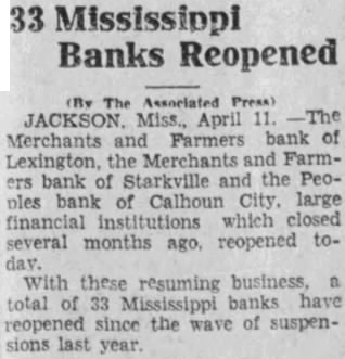 33 Mississippi Banks Reopened (By The Associated Press) JACKSON. Miss., April The Merchants and Farmers bank of Lexington, the Merchants and Farmers bank of Starkville and the Peoples bank of Calhoun City, large financial which closed several months ago. reopened today. with these resuming business, a total of 33 Mississippi banks have reopened since the wave of suspensions last year.