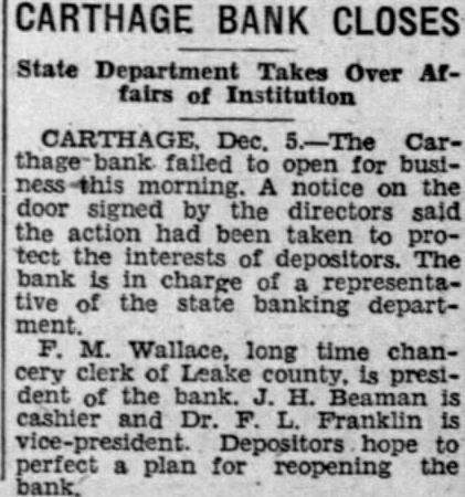 CARTHAGE BANK CLOSES State Department Takes Over Affairs of Institution CARTHAGE Dec. 5.-The Carthage bank failed to open for business this morning. A notice on the door signed by the directors said the action had been taken to protect the interests of depositors. The bank is in charge of representative of the state banking department F. M. Wallace, long time chancery clerk of Leake county, is president of the bank. J. H. Beaman is cashier and Dr. F. L. Franklin is vice-president. Depositors hope to perfect plan for reopening the