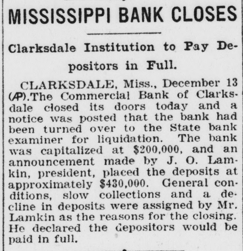 MISSISSIPPI BANK CLOSES Clarksdale Institution to Pay Depositors in Full. CLARKSDALE, Miss., December 13 (AP).The Commercial Bank of Clarksdale closed its doors today and a notice was posted that the bank had been turned over to the State bank examiner for liquidation. The bank was capitalized at $200,000, and an announcement made by J. O. Lamkin, president, placed the deposits at approximately $430,000. General conditions, slow collections and a decline in deposits were assigned by Mr. Lamkin as the reasons for the closing. He declared the depositors would be paid in full.