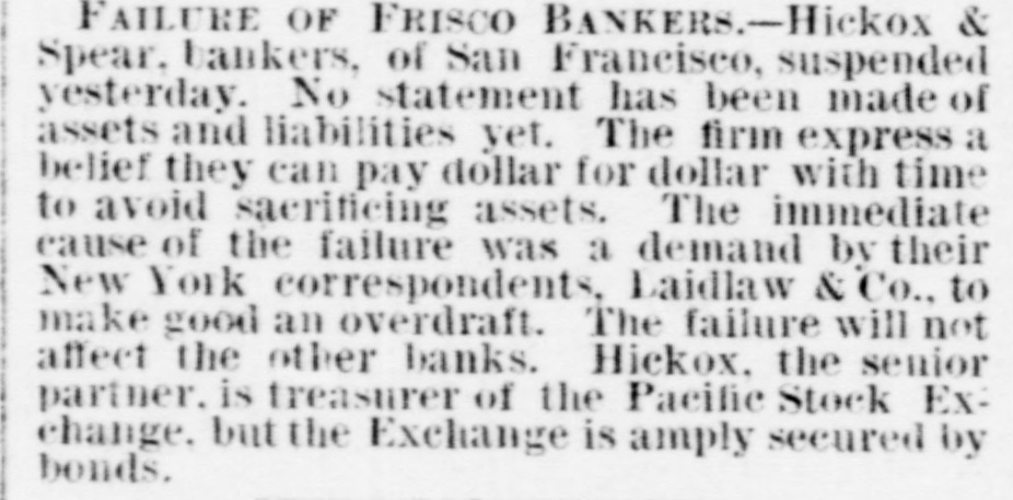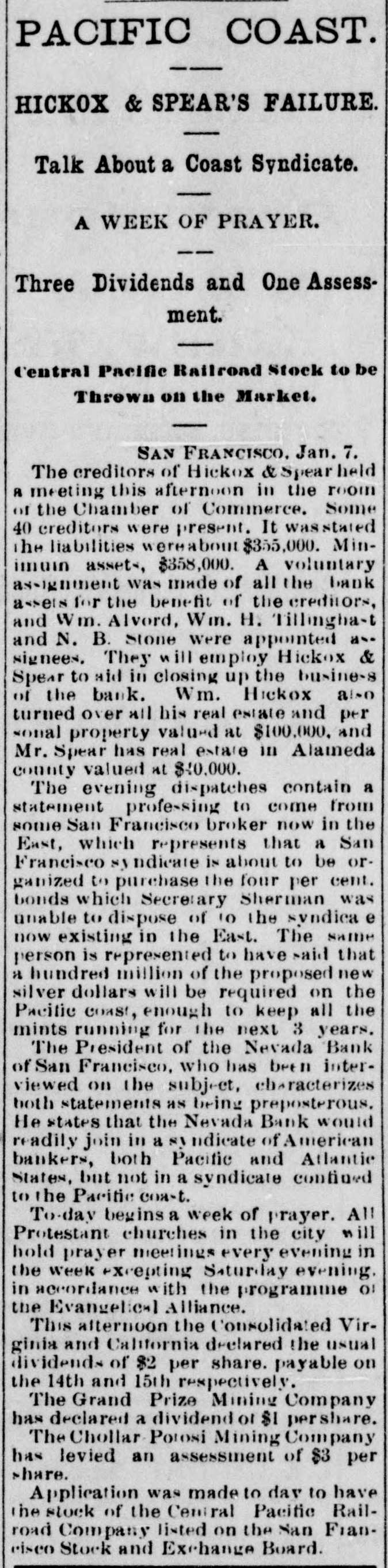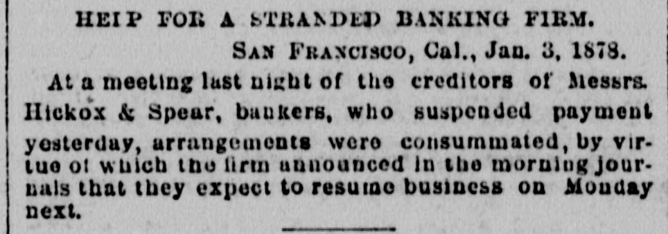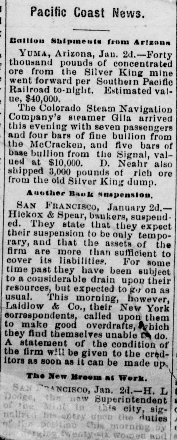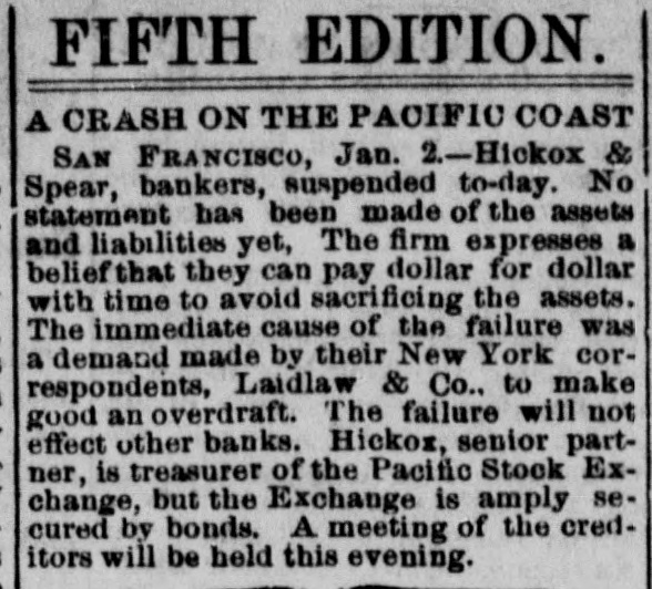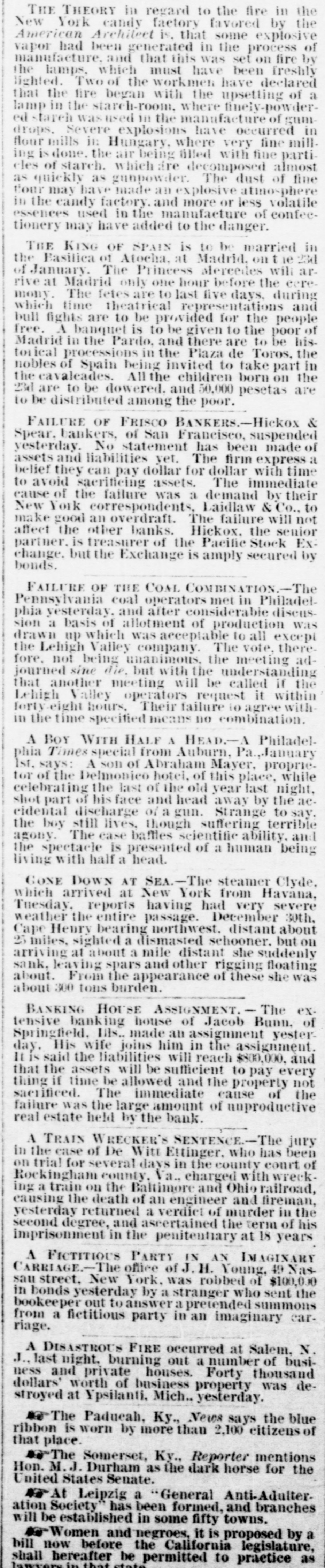 FAILURE OF FRISCO BANKERS.-Hickox & Spear. bankers, of San Francisco, suspended yesterday. No statement has been made of assets and liabilities yet. The firm express a belief they can pay dollar for dollar with time to avoid sacrificing assets. The immediate cause of the failure was a demand by their New York correspondents, Laidlaw & Co., to make good an overdraft. The failure will not affect the other banks. Hickox, the senior partner. is treasurer of the Pacific Stock Exchange. but the Exchange is amply secured by bonds. FAILURE OF THE COAL COMBNATION.-The Pennsylvania coal operators met in Philadelphia yesterday, and after considerable discussion a basis of allotment of production was drawn up which was acceptable to all except the Lehigh Valley company. The vote. therefore. not being unanimous. the meeting adjourned sine die. but with the understanding that another meeting will be called if the Lehigh Valley operators request it within forty eight hours. Their failure to agree with III the time specified means no combination. A Boy WITH HALF A HEAD.-A Philadelphia Times special from Auburn. January 1st. says: A son of Abraham Mayer, proprietor of the Delmonico hotel, of this place, while celebrating the last of the old year last night, shot part of his face and head away by the aecidental discharge of a gun. Strange to say. the boy still lives, though suffering terrible agony. The case baffles scientific ability. and the spectacle is presented of a human being living with half a head. GONE DOWN AT SEA.-The steamer Clyde, which arrived at New York from Havana, Tuesday, reports having had very severe weather the entire passage. December 30th, Cape Henry bearing northwest. distant about 25 miles, sighted a dismasted schooner. but on arriving at about a mile distant she suddenly sank, leaving spars and other rigging floating about. From the appearance of these she was about 300 tons burden. BANKING HOUSE ASSIGNMENT.- The extensive banking house of Jacob Bunn. of Springfield, Ills., made an assignment yesterday. His wife joins him in the assignment. It is said the liabilities will reach $800,000, and that the assets will be sufficient to pay every thing if time be allowed and the property not sacrificed. The immediate cause of the failure was the large amount of unproductive real estate held by the bank. A TRAIN WRECKER'S SENTENCE-The jury in the case of De Witt Ettinger, who has been on trial for several days in the county court of Rockingham county, Va., charged with wrecking a train on the Baltimore and Ohio railroad, causing the death of an engineer and fireman, yesterday returned a verdict of murder in the second degree, and ascertained the term of his imprisonment in the penitentiary at 18 years A FICTITIOUS PARTY IN AN IMAGINARY CARRIAGE.-The office of J.H. Young, 49 Nassau street. New York, was robbed of $100,000 in bonds yesterday by a stranger who sent the bookeeper out to answer a pretended summons from riage. a fictitious party in an imaginary carA DISASTROUS FIRE occurred at Salem, N. J., last night. burning out a number of business and private houses. Forty thousand dollars' worth of business property was destroyed at Ypsilanti, Mich.. yesterday. The Paducah, Ky., News says the blue ribbon is worn by more than 2,100 citizens of that place. The Somerset, Ky., Reporter mentions Hon. M.J. Durham as the dark horse for the United States Senate. At Leipzig a "General Anti-Adulteration Society" has been formed, and branches will be established in some fifty towns. Women and negroes, it is proposed by a bill now before the California legislature, shall hereafter be permitted to practice as lawvers in that state