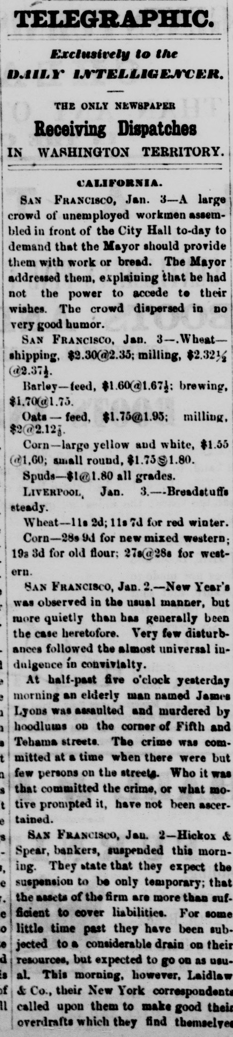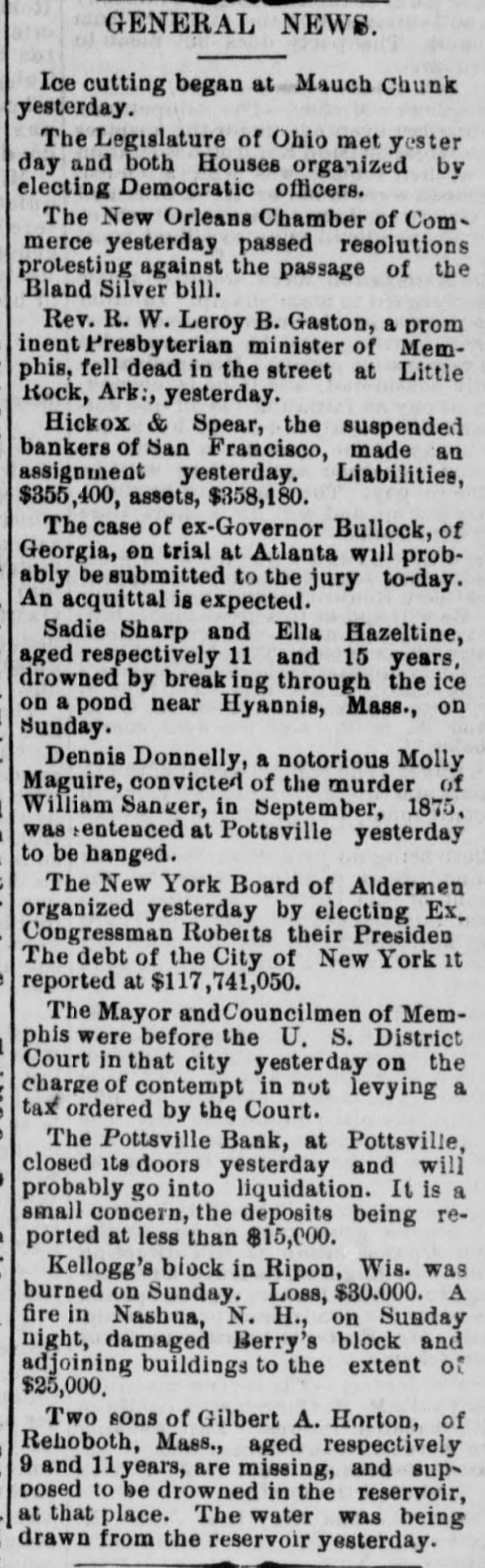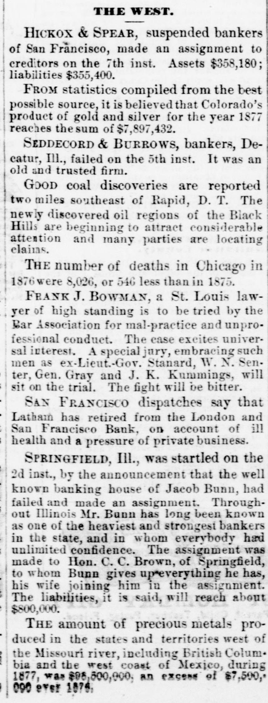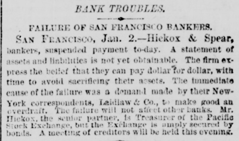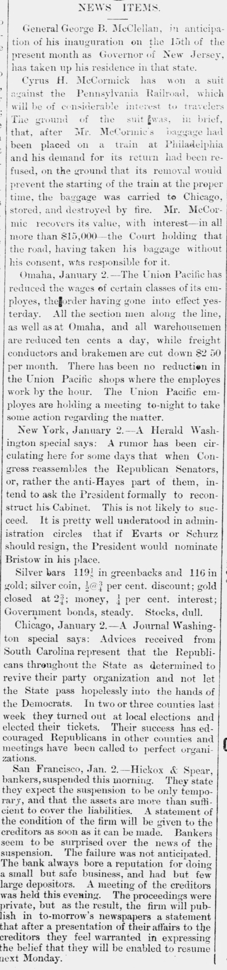FAILURE OF FRISCO BANKERS.-Hickox & Spear. bankers, of San Francisco, suspended yesterday. No statement has been made of assets and liabilities yet. The firm express a belief they can pay dollar for dollar with time to avoid sacrificing assets. The immediate cause of the failure was a demand by their New York correspondents, Laidlaw & Co., to make good an overdraft. The failure will not affect the other banks. Hickox, the senior partner. is treasurer of the Pacific Stock Exchange. but the Exchange is amply secured by bonds. FAILURE OF THE COAL COMBNATION.-The Pennsylvania coal operators met in Philadelphia yesterday, and after considerable discussion a basis of allotment of production was drawn up which was acceptable to all except the Lehigh Valley company. The vote. therefore. not being unanimous. the meeting adjourned sine die. but with the understanding that another meeting will be called if the Lehigh Valley operators request it within forty eight hours. Their failure to agree with III the time specified means no combination. A Boy WITH HALF A HEAD.-A Philadelphia Times special from Auburn. January 1st. says: A son of Abraham Mayer, proprietor of the Delmonico hotel, of this place, while celebrating the last of the old year last night, shot part of his face and head away by the aecidental discharge of a gun. Strange to say. the boy still lives, though suffering terrible agony. The case baffles scientific ability. and the spectacle is presented of a human being living with half a head. GONE DOWN AT SEA.-The steamer Clyde, which arrived at New York from Havana, Tuesday, reports having had very severe weather the entire passage. December 30th, Cape Henry bearing northwest. distant about 25 miles, sighted a dismasted schooner. but on arriving at about a mile distant she suddenly sank, leaving spars and other rigging floating about. From the appearance of these she was about 300 tons burden. BANKING HOUSE ASSIGNMENT.- The extensive banking house of Jacob Bunn. of Springfield, Ills., made an assignment yesterday. His wife joins him in the assignment. It is said the liabilities will reach $800,000, and that the assets will be sufficient to pay every thing if time be allowed and the property not sacrificed. The immediate cause of the failure was the large amount of unproductive real estate held by the bank. A TRAIN WRECKER'S SENTENCE-The jury in the case of De Witt Ettinger, who has been on trial for several days in the county court of Rockingham county, Va., charged with wrecking a train on the Baltimore and Ohio railroad, causing the death of an engineer and fireman, yesterday returned a verdict of murder in the second degree, and ascertained the term of his imprisonment in the penitentiary at 18 years A FICTITIOUS PARTY IN AN IMAGINARY CARRIAGE.-The office of J.H. Young, 49 Nassau street. New York, was robbed of $100,000 in bonds yesterday by a stranger who sent the bookeeper out to answer a pretended summons from riage. a fictitious party in an imaginary carA DISASTROUS FIRE occurred at Salem, N. J., last night. burning out a number of business and private houses. Forty thousand dollars' worth of business property was destroyed at Ypsilanti, Mich.. yesterday. The Paducah, Ky., News says the blue ribbon is worn by more than 2,100 citizens of that place. The Somerset, Ky., Reporter mentions Hon. M.J. Durham as the dark horse for the United States Senate. At Leipzig a "General Anti-Adulteration Society" has been formed, and branches will be established in some fifty towns. Women and negroes, it is proposed by a bill now before the California legislature, shall hereafter be permitted to practice as lawvers in that state