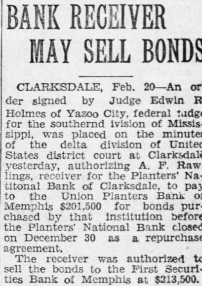 RECEIVER MAY SELL BONDS CLARKSDALE, Feb. der signed by Judge Edwin Holmes of Yazoo City, federal tudge for southernd ivision of Mississippi, was placed on the minutes the delta division of United States district court yesterday, Rawlings, the Natitonal Bank pay the Union Planters bonds chased that institution before the Planters' Bank closed on December 30 as repurchase agreement. The receiver was authorized the bonds the First SecuriBank of Memphis at $213,500.