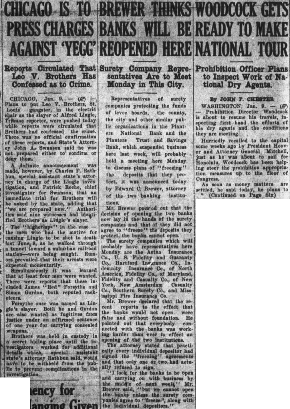 CHICAGO IS TO BREWER THINKS WOODCOCK GETS PRESS CHARGES BANKS WILL BE READY TO MAKE AGAINST 'YEGG' REOPENED HERE NATIONAL TOUR