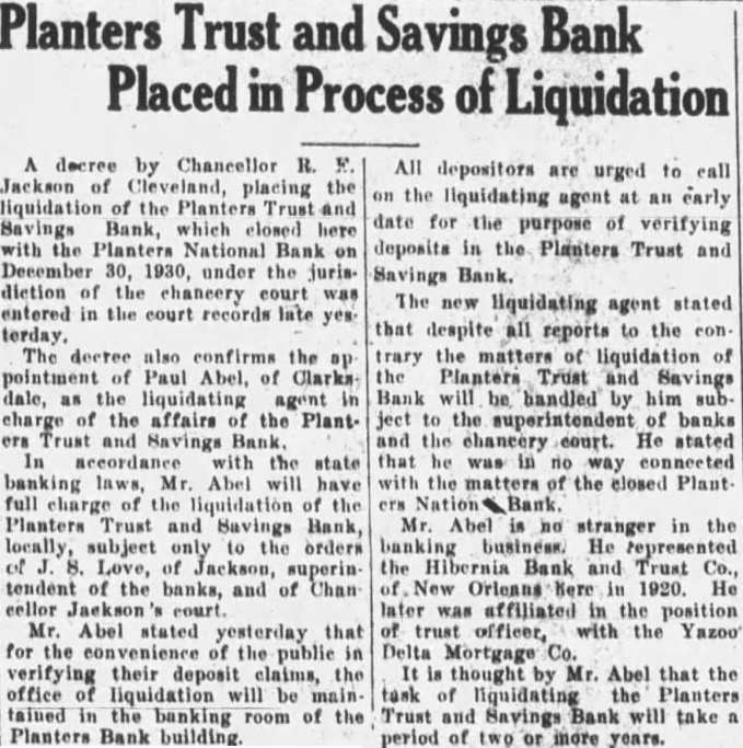 Representatives of surety companies protecting the funds of levee boards, the county, the city and other similar publie organizations in the Plant. ers National Bank and the Planters Trust and Savings Bank, which suspended business here last week, will probably hold a meeting here Monday to discuss plans of freezing the deposits that they proteet, it was announced today by Edward C. Brewer, attorney of the two banking instituMr. Brewer pointed out that the decision of opening the two banks now lay the hands of the surety companies and that if they did not agree to 'freeze' the deposits they protect, the banks cannot open. The surety companies which will probably have representatives here Monday are the Aetna Insurance Co., 8. Fidelity and Guaranty Co., Hartford rance Co., Indemnity Insurance Co., of North America, Fidelity Co., of Maryland, Fidelity and Casualty Co., of New York, New Amsterdam Casualty Co., Southern Surety Co., and Miss issippi Fire Insurance Co. Mr. Brewer declared that the recent reports to the effect that the banks would not open were false and without foundation. He pointed out that everybody eonneeted with the banks was working barder than ever to effect an opening of the two Institutions. The attorney stated that practieally every individual depositor had signed the "freezing" agreements and that only one or two had actually refused to sign. look for the banks to be open and carrying on with business by the middle of next weels Mr. said, we cannot open the banks unless the surety companies agree to "freeze", along with the individual depositors.