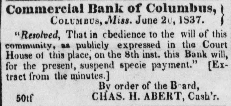 We beg leave to correct an error into which the capable editor of the Manchester Whig has fallen, in saying that the Commercial Bank of Columbus has increased its circulation seventy-five thousand dollars since the suspension of specie payments. This is not the case; this institution issued last year about five hundred thousand dollars in post notes, payable in Mobile. These notes have been redeemed, with the exception of about fifty thousand dollars. The bank has used all the avails of its cotton in the redemption of these issues, which are at par and are sought for with as much eagerness as Mobile money; thus in fact furnishing an exchange for the community at par, which no other institution in Mississippi, Alabama or Tennessee has yet done, since the suspension of specie payments. Although the Commercial Bank may have increased its circulation at its counter, the sum stated by the Whig, yet its curtailments in another quarter have amounted to nearly half a million.