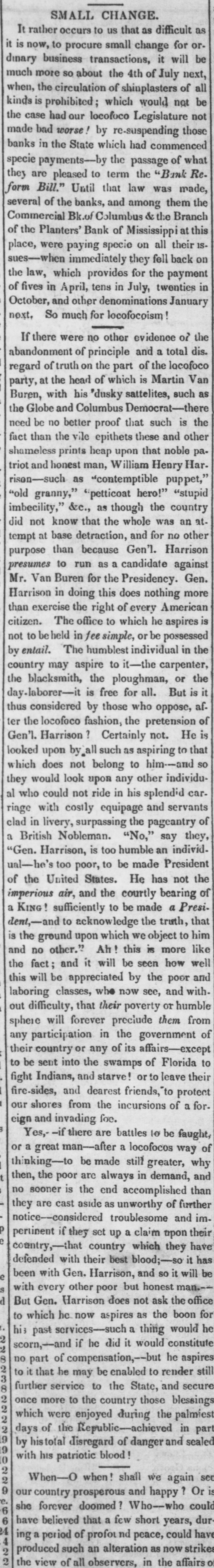 SMALL CHANGE. It rather occurs to us that as difficult it is now, to procure small change for ordinary business transactions, it will be much more so about the 4th of July next, when, the circulation of shinplasters of all kinds is prohibited; which would not be the case had our locofoco Legislature not made bad worse! by re-suspending those banks in the State which had commenced specie payments-by the passage of what they are pleased to term the "Bank Re. form Bill." Until that law was made, several of the banks, and among them the Commercial Bk.of Columbus & the Branch of the Planters' Bank of Mississippi at this were specie on ISplace, paying they fell all back their sues-when immediately on the which provides for payment of fives in tens in in law, April, July, the twenties October, and other denominations January next, So much for locofocoism! If there were no other evidence of the abandonment of principle and a total dis. regard of truth on the part of the lacofoco party, at the head of which is Martin Van with his *dusky sattelites, such as Columbus the Buren, Globe and Democrat-there need be no better proof that such is the fact than the vile epithets these and other shameless prints heap upon that noble paHenry Harand honest man, William rison-such as "contemptible puppet," ''petticoat "old granny," hero!" the country "stupid imbecility," &c., as though know that the whole was an at. at base detraction, and no tempt did not for Harrison other purpose than because Gen'l. presumes to run as a candidate against Mr. Van Buren for the Presidency. Gen. Harrison in doing this does nothing more than exercise the right of every American citizen. The office to which he aspires not to be held in fee simple, or be possessed entail. The humblest individual in the country may aspire to it-the carpenter, the blacksmith, the ploughman, or the day-laborer-it is free for all. But is it thus considered by those who oppose, after the locofoco fashion, the pretension of Gen'l. Harrison ? Certainly not. He looked upon by, (all such as aspiring to that which does not belong to him--and s they would look upon any other individual who could not ride in his splendid carriage with costly equipage and servants clad in livery, surpassing the pageantry of a British Nobleman. "No," say they, "Gen. Harrison, is too humble an individual-he's too poor, to be made President of the United States. He has not the air, and the courtly bearing of a KING! to be a imperious sufficiently made truth, Presi- that dent,-and to acknowledge the is the ground upon which we object to him and no other." Ah this is more like and it will be seen how well will be by poor the this fact appreciated the and with- and laboring classes, who now see, out difficulty, that their poverty or humble sphere will forever preciude them from any participation in the government of their country or any of its affairs-except sent into the swamps and starve! or to to fight be Indians, of leave Florida their to fire-sides, and dearest friends, to protect our shores from the incursions of a for eign and invading for. Yes, -if there are battles to be faught, or a great man-after a locofocos way of thinking-to be made still greater, why then, the poor are always in demand, and no sooner is the end accomplished than they are cast aside as unworthy of further troublesome and impertinent notice--considered they if set up a claim upon their country,-that country which they have defended with their best blood;-so it has been with Gen. Harrison, and so it will be with every other poor but honest man.d But Gen. Harrison does not ask the office to which he now aspires as the boon for his past services-such a thing would he scorn,-and if he did it would constitute no part of compensation,--but he aspires to it that he may be enabled to render still 8 further service to the State, and secure once more to the country those blessings 2 2 which were enjoyed during the palmiest 2 days of the Republic-achieved in part 19 9 by histotal disregard of danger and sealed to with his patriotic blood! 2 2 When-O when shall we again 9 is our country prosperous and happy ? Or 6 she forever doomed Who--who could 6 have believed that a few short years, dur 24 4 ing a period of profot nd peace, could have 2 produced such an alteration as now strikes the view of all observers, in the affairs
