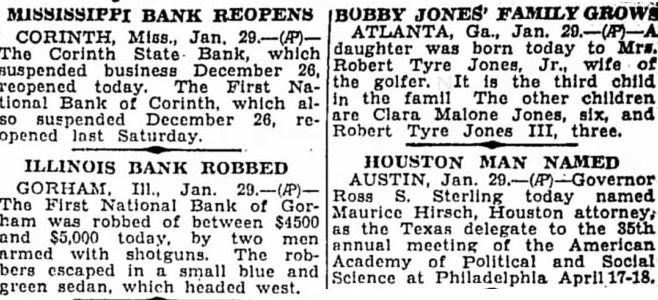 MISSISSIPPI BANK REOPENS CORINTH, Miss., Jan. 29.-(P)The Corinth State Bank, which suspended business December 26, reopened today. The First National Bank of Corinth, which also suspended December 26, reopened last Saturday. ILLINOIS BANK ROBBED GORHAM. III., Jan. 29.-(P)The First National Bank of Gorham was robbed of between $4500 and $5,000 today, by two men armed with shotguns. The robbers escaped in a small blue and green sedan, which headed west. BOBBY JONES' FAMILY GROWS ATLANTA, Ga., Jan. daughter was born today to Mrs. Robert Tyre Jones wife of the golfer. It is the third child in the famil The other children are Clara Malone Jones, six, and Robert Tyre Jones III, three. HOUSTON MAN NAMED AUSTIN, Jan. 29.-(P)-Governor Ross S. Sterling today named Maurice Hirsch, Houston attorney, as the Texas delegate to the 35th annual meeting of the American Academy of Political and Social Science at Philadelphia April 17-18.