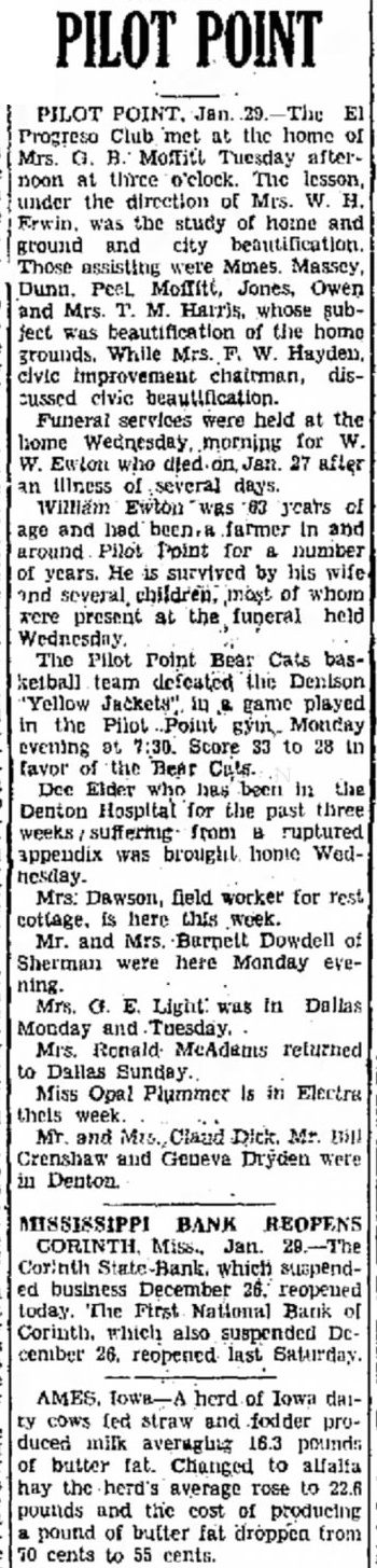 PILOT POINT PILOT POINT. Jan. 29. El Progreso Club met at the home of Mrs. G. B. Moffitt Tuesday afternoon at three o'clock. The lesson, under the direction of Mrs. W. H. Erwin. was the study of home and ground and city beautification Those assisting were Mmes. Massey, Dunn. Peel Moffitt. Jones, Owen and Mrs. T. M. Harr)s, whose subfect was beautification of the home grounds. While Mrs. F. W. Hayden. civic improvement chairman, discussed clvic beautification. Funeral services were held at the home Wednesday, morning for W. W. Ewion who died on Jan. 27 after an illness of several days. William Ewton WRS 63 years of age and had been.a farmer In and around Pilot Point for a number of years. He is survived by his wife and several children. most of whom were present at the funeral held The Pilot Point Bear Cats basketball team defeated the Denison 'Yellow Jackets" in & game played in the Pilot Point gym. Monday evening at 7:30. Score 33 to 28 in favor of the Bear Cuts. Dec Elder who has been in the Denton Hospital for the past three weeks suffering from B ruptured appendix was brought home Wednesday. Mrs: Dawson, field worker for rest cottage. is here this week. Mr. and Mrs. Barnett Dowdell of Sherman were here Monday evening. Mrs. Cf. E. Light was In Dallas Monday and Tuesday. Mrs. Ronald McAdams returned to Dallas Sunday. Miss Opal Plummer Is in Electra theis week MY and Mrs. Claud Dick. Mr Bill Crenshaw and Geneva Dryden were in Denton MISSISSIPPI BANK REOPENS Corinth State Bank. which suspended business December 26. reopened today. The First National Bank of Corinth. which also suspended DCcember 26, reopened last Saturday. AMES. Towa-A herd of Iowa daity cows (ed straw and fodder produced milk averaging 16.3 pounds of butter fat. Changed to alfalfa hay the herd's average rose to 22.6 pounds and the cost of producing pound of butter fat droppen trom 70 cents to 55 cents.
