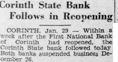 The bank suspended business on December 26, 1930 along with several nearby banks after the People's Bank announced it had shut its doors (closure of a local bank sparked the wave). Multiple AP dispatches dated Jan 29, 1931 report the Corinth State Bank reopened that day. No article describes a depositor run specifically on the Corinth State Bank itself; closures are presented as part of a local cluster tied to other banks' distress.