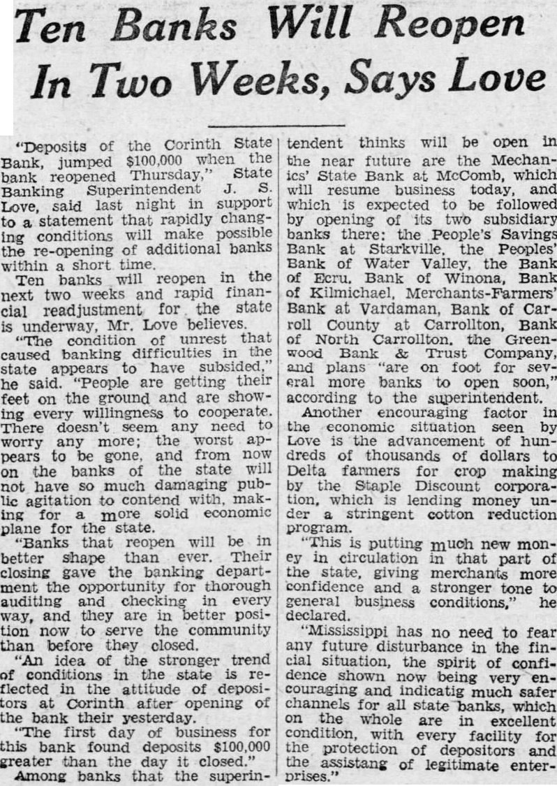 Banks Will Reopen Ten In Two Weeks, Says Love Corinth State "Deposits of the when the Bank, jumped Thursday, State bank reopened Banking last night in support Love, statement rapidly changconditions make banks re-opening short in the Ten banks reopen weeks rapid finannext for the state underway, Mr. Love that condition banking difficulties in the caused state appears have "People are getting their he said. the ground and are showfeet willingness to every doesn't seem any need There worry any more; worst pears gone, and from banks state have much damaging lic to contend more solid economic plane for the state. that reopen will be in better shape than Their closing gave the department the for thorough in every and they are in better position serve the community than before they closed. idea of the stronger trend the flected the attitude of deposiCorinth after opening the their of business for this bank found deposits greater than day closed." Among banks that the superin- tendent thinks will be in the near future are MechanState Bank which which be followed opening of subsidiary there: the People's Savings Bank Peoples Bank Water Bank Ecru. Bank of Winona, Bank Bank at Vardaman, Bank of Carroll County Carrollton, Bank North the Greenwood Bank Trust Company, plans on foot for more banks to open according to the superintendent. Another factor the situation seen Love the advancement of hundreds thousands dollars Delta farmers for crop making Staple Discount tion, which lending money der stringent cotton reduction program. putting much new monin that part of state, giving more stronger tone general business he declared. Mississippi has no need to fear future in the finthe spirit confishown being couraging channels state which the whole are in excellent every facility the protection of depositors the assistang of legitimate enter-