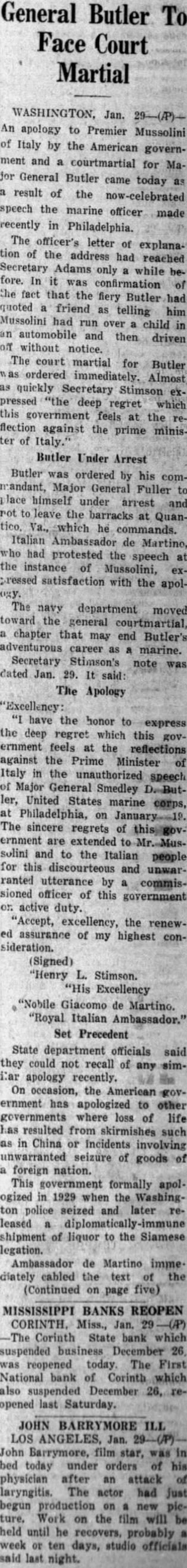 General Butler To Face Court Martial WASHINGTON, Jan. An apology to Premier Mussolini of Italy by the American government and courtmartial for Mafor General Butler came today result of the now-celebrated speech the marine officer made recently in Philadelphia. The officer's letter of explanation of the address had reached Secretary Adams only while before. In it was confirmation the fact that the fiery Butler had quoted friend as telling him Mussolini had run over child in an automobile and then driven off without notice. The court martial for Butler ordered immediately. Almost as quickly Secretary Stimson expressed "the deep regret which this government feels at the flection against the prime minister of Italy.' Butler Under Arrest Butler was ordered by his commandant, Major General Fuller place himself under arrest and rot to the barracks at Quantico, he commands. Italian Ambassador de Martino, who had protested the speech at the instance of Mussolini, expressed satisfaction with the apolThe navy department moved toward the general courtmartial, chapter that may end Butler's adventurous career as marine. Secretary Stimson's note dated Jan. 29. It said: The Apology "Excellency: have the honor to the deep regret which this government feels at the reflections against the Prime Minister of Italy in the unauthorized speech of Major General Smedley D. Butler, United States marine corps, at Philadelphia, on The sincere regrets of ernment are extended solini and to the Italian people for this discourteous and unwarranted utterance by commissioned officer of this government on active duty. "Accept, excellency, the renewed assurance of my highest consideration. (Signed) "Henry L. Stimson. "His Excellency "Nobile Giacomo de Martino. "Royal Italian Ambassador." Set Precedent State department officials said they could not recall of any ilar apology recently. On occasion, the American government has apologized to other governments where loss of life has resulted from skirmishes such as in China or Incidents involving unwarranted seizure of goods foreign nation. This government formally apologized in 1929 when the Washington police seized and leased shipment of liquor to the Siamese legation. Ambassador de Martino imme. diately cabled the text of the (Continued on page five) MISSISSIPPI BANKS REOPEN CORINTH. Miss., Jan. Corinth State bank which suspended business December 26, was reopened today. The First National bank of Corinth which also suspended December 26, opened last Saturday. JOHN BARRYMORE ILL LOS ANGELES, Jan. John Barrymore, film star, in bed today under orders of his physician after an attack laryngitis. The actor had just begun production on new picture. Work on the film will be held until he recovers, probably week or ten days, studio officials last night.