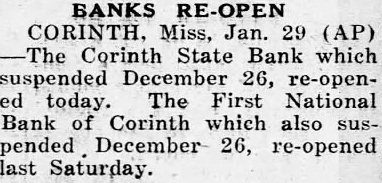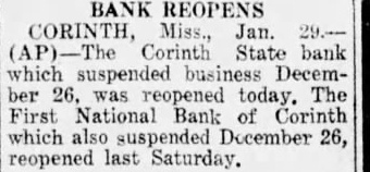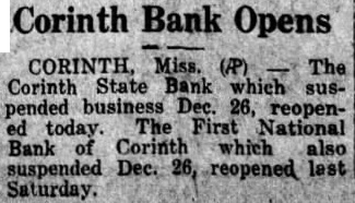 All were within a radius of about thirty miles, and the situation was described as local one ... Others were its two branches at Nettleton and Rienzi, the First National bank and the Corinth State bank. Corinth ... Many attributed the closing to the announcement that the People's bank had shut its doors