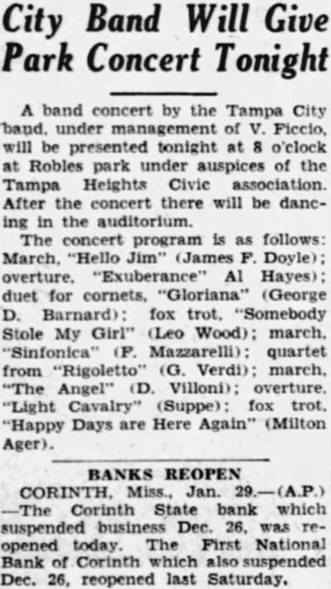 City Band Will Give Park Concert Tonight A band concert by the Tampa City band. under management of V. Ficcio, will be presented tonight at 8 o'clock at Robles park under auspices of the Tampa Heights Civic association. After the concert there will be dancing in the auditorium. The concert program is as follows: March, "Hello Jim" (James F. Doyle); overture. "Exuberance" Al Hayes); duet for cornets, "Gloriana" (George D. Barnard): fox trot. "Somebody Stole My Girl" (Leo Wood): march. "Sinfonica" (F. Mazzarelli): quartet from "Rigoletto" (G. Verdi); march. "The Angel" (D. Villoni); overture. "Light Cavalry" (Suppe): fox trot. "Happy Days are Here Again" (Milton Ager). BANKS REOPEN CORINTH. Miss., Jan. 29.-(A.P.) -The Corinth State bank which suspended business Dec. 26, was reopened today. The First National Bank Corinth which suspended Dec. 26, reopened last Saturday.