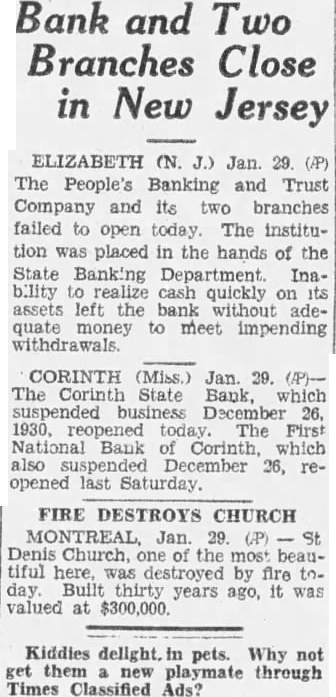 Bank and Two Branches Close in New Jersey ELIZABETH (N. J.) Jan. 29 (AP) The People's Banking and Trust Company and its two branches failed to open today. The institution was placed in the hands of the State Banking Department Inability to realize cash quickly on its assets left the bank without adequate money to meet impending CORINTH (Miss.) Jan. 29. (AP)-The Corinth State Bank, which suspended business December 26, 1930, The First National Bank of Corinth, which also December 26, reopened last Saturday. FIRE DESTROYS CHURCH MONTREAL Jan. 29. (P) St Church, one of the most beautiful here, was destroyed by fire toBuilt years ago, it was valued at $300,000 Kiddies delight. in pets. Why not get them through Times Classified Ads?