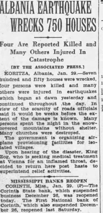ALBANIA EARTHQUAKE WRECKS 750 HOUSES Four Are Reported Killed and Many Others Injured In Catastrophe [BY THE ASSOCIATED PRESS.] KORITZA, Albania, Jan. 29.-Seven hundred and fifty houses were wrecked, four persons were killed and many others were injured in earthquakes which began at dawn yesterday and continued throughout the day. In view of the scarcity of roads officials said it would be weeks before the extent of the damage is known. Many persons spent the night in the snowcovered mountains without shelter. Many churches were destroyed. The government is organizing airplane provisioning facilities for isolated villages. Upon hearing of the disaster. King Zog. who treatment at Vienna for an inflamed throat, decided to return here post haste to superintend relief activities. MISSISSIPPI BANKS REOPEN CORINTH, Miss., Jan. 29. (/P)-The Corints State bank, which suspended business 26, was reopened today. The First National bank of Corinth, which also suspended December 26, reopened last Saturday.