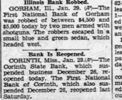 Illinois Bank Robbed. GORHAM, Jan. 29. National Bank of Gorham First robbed of between and today two men armed with shotguns. The robbers escaped small blue and green sedan, which headed west. Bank Is Reopened. CORINTH, Miss., Jan. Corinth State Bank, which suspended business December 26, today. The First National opened Bank of Corinth, which also December 26, reopened last pended Saturday.