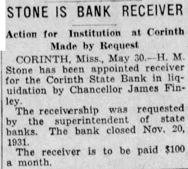 STONE IS BANK RECEIVER Action for Institution at Corinth Made by Request CORINTH. Miss. May M Stone been receiver for the Corinth State Bank in liquidation by Chancellor James FinThe receivership was requested superintendent state the closed Nov. 20, banks. The bank 1931. receiver be paid $100 The is to month.