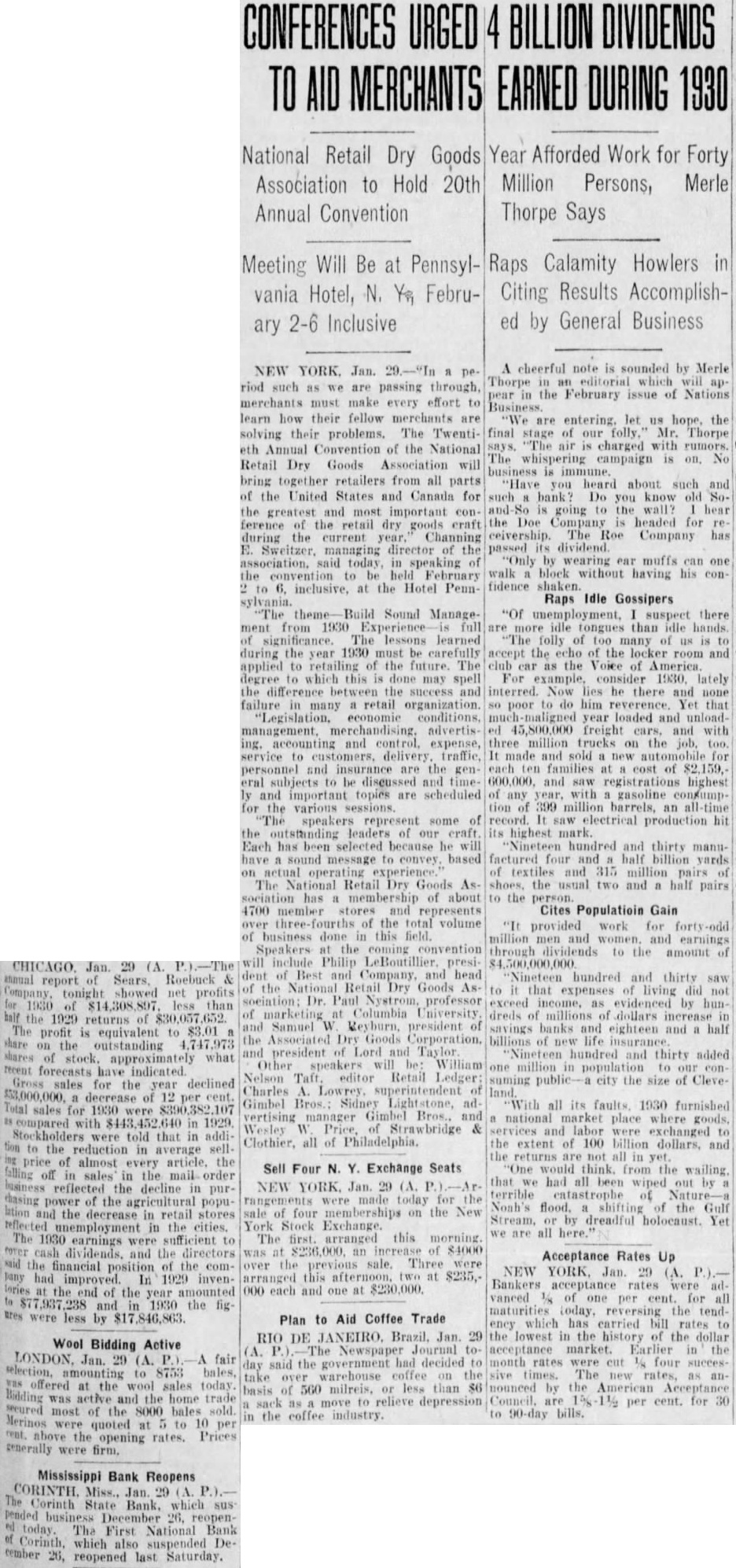 Raps Idle Gossipers sylvania. Sound Manage- "Of full are idle than idle of The lessons learned The folly of too of during the year 1930 must carefully the echo of the locker room and applied to retailing the The club car as the Voice of America. degree this may spell lately the between the success and interred and none retail do him that economic loaded and advertis- 45,800,000 freight cars, and with and expense, three trucks on service to and are the each of eral discussed and and saw highest and important are of any gasoline the various tion 399 million an time speakers represent some of saw hit the outstanding its highest Each has because he will thirty have four half 315 The National Retail Dry Goods the usual two and half has membership about to the 4700 member stores represents Cites Population Gain the total volume "It provided work for of business this field. and Speakers the include Philip LeBoutillier president and and head Nineteen hundred thirty and saw the Retail Goods to that expenses living did Dr. professor exceed evidenced by hunColumbia dreds dollars and Samuel president banks and half savings eighteen the Associated Dry billions and president of hundred thirty added Other speakers William one Nelson Taft. Retail Ledger: suming public- city the size of CleveCharles Gimbel Bros. all its 1930 furnished vertising and Wesley services and labor exchanged Clothier, all of Philadelphia. the extent 100 billion and annual Roebuck tonight showed net profits 1930 of less than the 1929 returns of $30,057,652 profit is equivalent to share on outstanding shares approximately what recent forecasts have Gross for the declined $53,000,000. decrease of 12 per Total sales for were with in told that in addition in average almost every the Sell Four N. Y. Exchange Seats off in the order reflected the decline NEW YORK Jan. purchasing of the popu- today for lation the sale four on the New and decrease in retail the The 1930 to The first. arranged this earnings were sufficient an of $4000 cash and the directors was said the the over the Three financial position had 1929 inven- this two at In 000 and one at $230,000. of the year and the fig ares were less by $17,846,863 Plan to Aid Coffee Trade the returns are One from that had all wiped terrible the Gulf by dreadful holocaust. Yet we are all