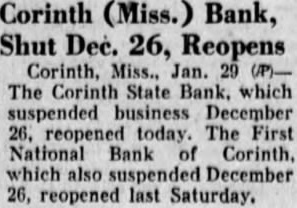 Corinth (Miss.) Bank, Shut Dec. 26, Reopens Corinth, Miss., Jan. The Corinth State Bank, which suspended business December 26, reopened today. The First National Bank of which also suspended December 26, reopened last Saturday.