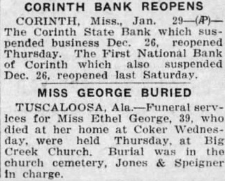 CORINTH BANK REOPENS Miss., Jan. The Corinth which pended Dec. The First National Bank Corinth which suspended Dec. last Saturday MISS GEORGE BURIED for George, died her Coker held Thursday Big Creek Church. Burial was church cemetery, Jones & Speigner