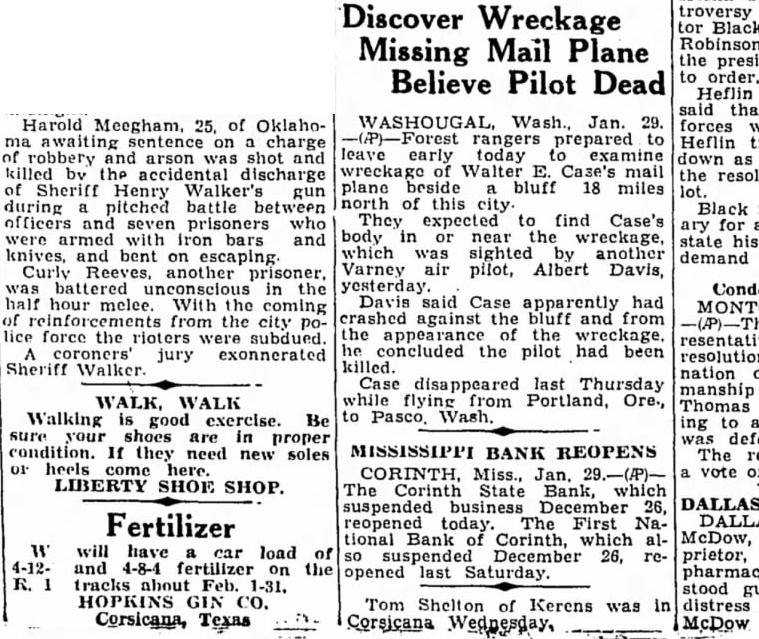 Jan. rangers prepared leave early today examine Walter mail plane beside bluff 18 miles north this expected find Case's body near wreckage, which was sighted Varney pilot, Albert Davis, yesterday Davis said Case apparently had against bluff concluded the pilot had been killed. disappeared last Thursday WALK, WALK Portland, Ore., Walking exercise. Be Wash. good shoes are proper they need new soles MISSISSIPPI BANK REOPENS CORINTH, Miss., Jan. LIBERTY SHOE SHOP. Bank, reopened today. First tional Bank Corinth, December 26, opened last Saturday.