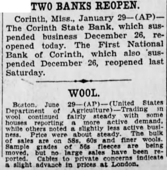 Jan. after the First National Bank Corinth had reopened, the Corinth State bank today Both banks suspended business December 26.