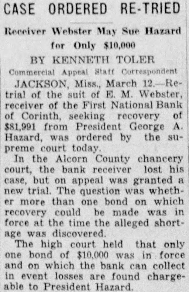 Appeal Staff JACKSON Miss. March Retrial of the suit of E. M. Webster, receiver of the First National Bank of Corinth, seeking recovery of $81,991 from President George A Hazard, was ordered by the supreme court today In the Alcorn County chancery court, the bank receiver lost his case, but on appeal was granted new trial. The question was whether more than one bond on which recovery could be made was in force at the time the alleged shortage was discovered. The high court held that only one bond of $10,000 was in force and on which the bank can collect in event losses are found chargeable to President Hazard.