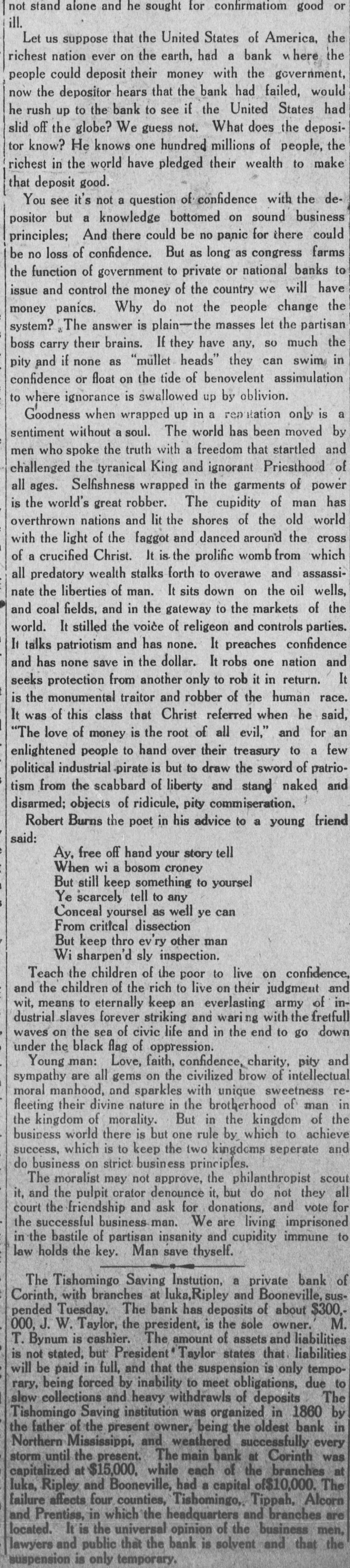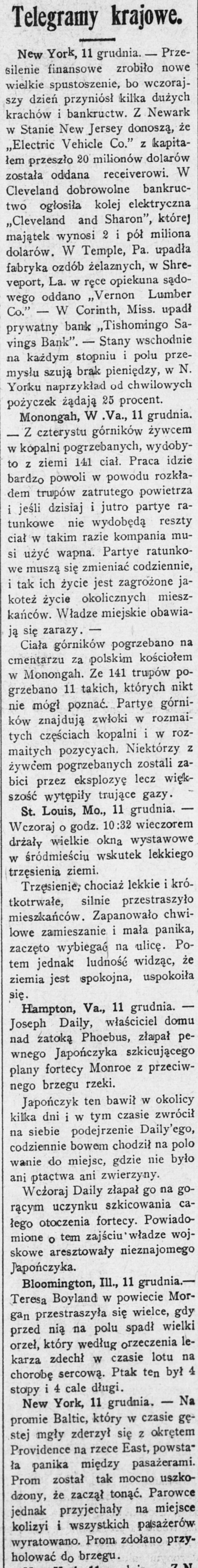 Telegramy krajowe. New York, 11 grudnia. - Przesilenie finansowe zrobito nowe wielkie spustoszenie, bo wczorajszy dzień przyniósł kilka dużych krachów i bankructw. Z Newark W Stanie New Jersey donoszą, ze Electric Vehicle Co." z kapitatem przeszło 20 milionów dolarów została oddana receiverowi. W Cleveland dobrowolne bankructwo ogłosiła kolej elektryczna Cleveland and Sharon", której majątek wynosi 2 i pół miliona dolarów. W Temple, Pa. upadła fabryka ozdób żelaznych, W Shreveport, La. W ręce opiekuna sądowego oddano Vernon Lumber Co." - W Corinth, Miss. upadł prywatny bank Tishomingo Savings Bank". - Stany wschodnie na każdym stopniu i polu przemyslu szują brak pieniędzy, W N. Yorku naprzykład od chwilowych pożyczek żądają 25 procent. Monongah, W .Va., 11 grudnia. - Z czterystu górników żywcem W kopalni pogrzebanych, wydobyto z ziemi 141 ciał. Praca idzie bardzo powoli W powodu rozkładem trupów zatrutego powietrza i jeśli dzisiaj i jutro partye ratunkowe nie wydobędą reszty ciał W takim razie kompania musi użyć wapna. Partye ratunkowe muszą się zmieniać codziennie, i tak ich życie jest zagrożone jakoteż życie okolicznych mieszkańców. Władze miejskie obawiają się zarazy Ciała górników pogrzebano na cmentarzu za polskim kościołem W Monongah. Ze 141 trupów pogrzebano 11 takich, których nikt nie mógł poznać. Partye górników znajdują zwłoki W rozmaitych częściach kopalni i W rozmaitych pozycyach. Niektórzy Z żywcem pogrzebanych zostali zabici przez eksplozyę lecz większość wytępiły trujące gazy. St. Louis, Mo., 11 grudnia. Wczoraj O godz. 10:32 wieczorem drżały wielkie okna wystawowe W śródmieściu wskutek lekkiego trzęsienia ziemi. Trzesienie, chociaż lekkie i krótkotrwałe, silnie przestraszyło mieszkańców. Zapanowało chwilowe zamieszanie i mała panika, zaczęto wybiegać na ulice. Potem jednak ludność widząc, ze ziemia jest spokojna, uspokoiła się. Hampton, Va., 11 grudnia. Joseph Daily, właściciel domu nad zatoką Phoebus, złapał pewnego Japończyka szkicującego plany fortecy Monroe z przeciwnego brzegu rzeki. Japończyk ten bawit W okolicy kilka dni i W tym czasie zwrócił na siebie podejrzenie Daily'ego, codziennie bowem chodził na polo wanie do miejsc, gdzie nie było ani ptactwa ani zwierzyny. Wcżoraj Daily złapał go na gorącym uczynku szkicowania całego otoczenia fortecy. Powiadomione o tem zajściu władze wojskowe aresztowały nieznajomego Þapończyka. Bloomington, Ill., 11 grudnia.Teresa Boyland W powiecie Morgan przestraszyła się wielce, gdy przed nią na polu spad} wielki orzeł, który według orzeczenia lekarza zdechł W czasie lotu na chorobę sercową. Ptak ten był 4 stopy i 4 cale długi. New York, 11 grudnia. - Na promie Baltic, który W czasie gestej mgły zderzył się Z okrętem Providence na rzece East, powstala panika między pasażerami. Prom został tak mocno uszkodzony, ze zaczął tonąć. Parowce jednak przyjechały na miejsce kolizyi i wszystkich palsażerów