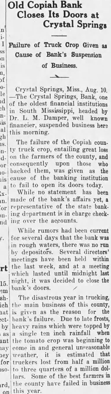 Old Copiah Bank Closes Its Doors at Crystal Springs Failure of Truck Crop Given Cause of Bank's Suspension of Business Crystal Springs, Miss., Aug. 10. Crystal Springs, Bank, one the oldest financial institutions South Mississippi, headed by Damper, well known financier, suspended business here this morning. The failure of the Copiah countruck entailing great loss crop, the farmers of the county, and consequently upon those who backed them, was given as the cause of the banking institution to fail to open its doors today. While no statement has been made of the bank's affairs representative of the state bank department is in charge checkthe accounts. While rumors had been current for several days that the bank rough waters, there was run by depositors. Several directors' have been held within the last week, and meeting which lasted until midnight last night, it was decided to close the doors. The disastrous year in trucking, the main business of this county, given as the reason for the failure. Due to late frosts, heavy rains which were topped by ten inch rainfall when single the tomato was beginning to crop in and general unseasonable come weather, estimated truckers lost from half million three of million dolquarters lars. Some of the best farmers the have failed in business county this year.