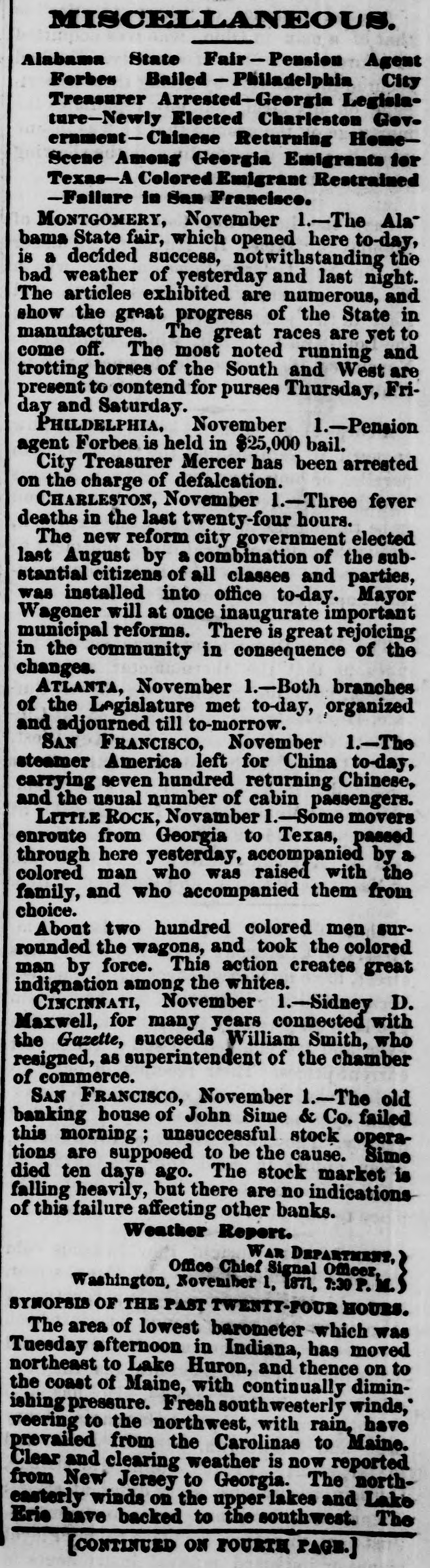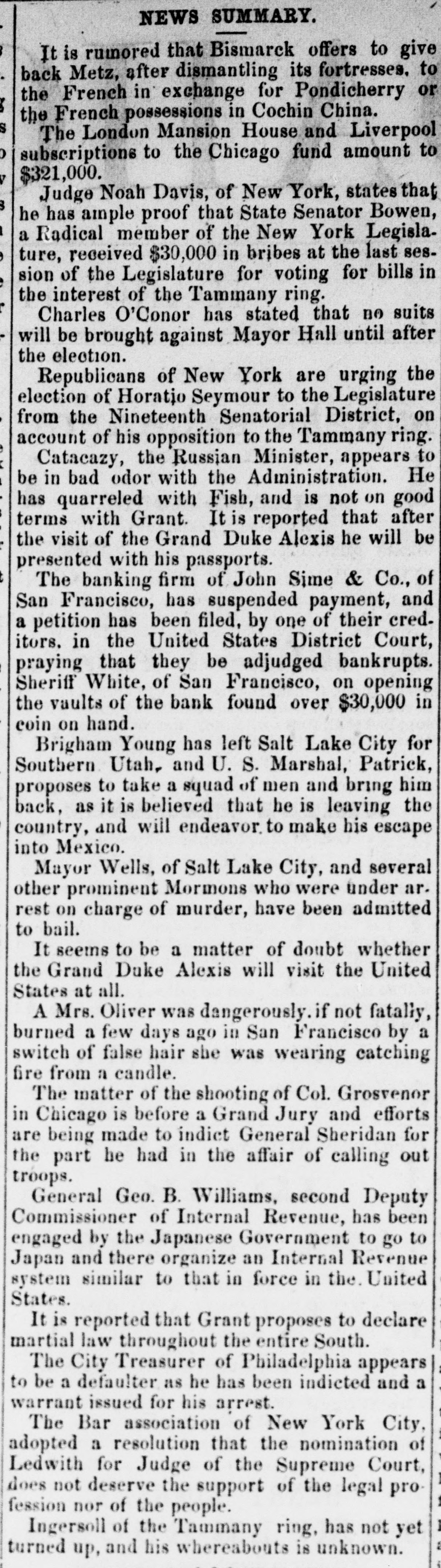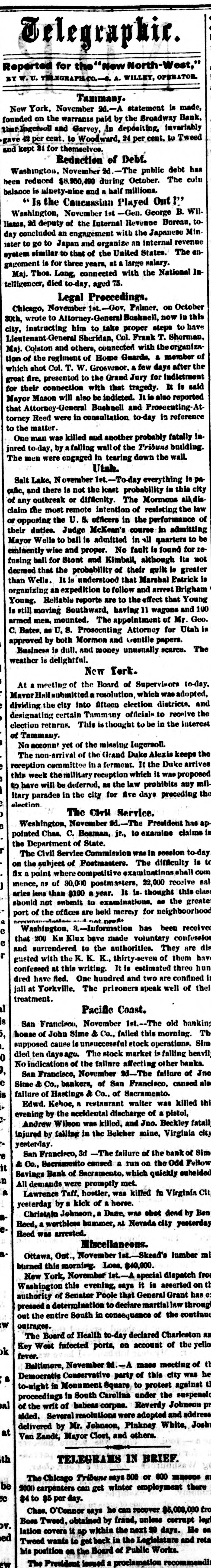 Telegraphic. Reported for the " New North-West, BY W.U. TELEGRAPH.CO.- A. WILLEY, OPERATOR. Tammany. New York, November 2d.-A statement is made, founded on the warrants paid by the Broadway Bank, that.Ingersoll and Garvey, An depositing, invariably gave 42 per cent. to Woodward, 24 per cent. to Tweed and kept 31 for themselves. Reduction of Debt. Washington. November ..The public debt has been reduced $8.950,490 during October. The coin balance is ninety-nine and half millions. " Is the Cancassian Played Out ?" Washington, November 1st -Gen. George B. Will liams, 2d deputy of the Internal Revenue Bureau, to day concluded an engagement with the Japanese Min later to go to Japan and organize an internal revenue system similar to that of the United States. The engagement is for three years, at large salary. Maj. Thos. Long, connected with the National In telligencer, died to-day. aged 75. Legal Proceedings. Chicago, November to- Palmer. on October 30th, wrote to Attorney-General Bushnell, now in this city, instructing him to take proper steps to have Lieutenant General Sheridan, Col. Frank T. Sherman. Maj. Colston and others, connected with the organiza tion of the regiment of Home Guards, a member of which shot Col. T. W. Grosvenor. a few days after the great fire, presented to the Grand Jury for indictment for their connection with that tragedy. It is said Mayor Mason will also be indicted. It is also reported that Attorney-General Bushnell and Prosecuting At torney Reed were in consultation to-day is reference to the matter. One man was killed and another probably fatally in jured to-day, by falling wall of the Tribune building The men were engaged in tearing down the wall. Utah. Salt Lake, N ovember 1et.-To-day everything is pacific, and there is not the least probability in this city of any outbreak or difficulty. The Mormons alkdis claim the most remote Intention of resieting the law or opposing the U S. officers in the performance of their duties. Judge McKean's course in admitting Mayor Wells to bail is admitted in all quarters to be eminently wise and proper. No fault is found for 10 fusing ball for Stont and Kimball, although its not deemed that the probability of their guilt is greater than Wells. It is understood that Marshal Patrick is organizing an expedition to follow and arrest Brigham Young. Reliable reports are to the effect that Young is etill moving Southward, having 11 wagons and 100 armed men, mounted. The appointment of Mr. Geo. c. Bater, as U. 8. Prosecuting Attorney for Utah is approved by both Mormon and Gentile papers. Business is dull, and money unusually scarce. The weather is delightful New York. At meeting of the Board of Supervisors to-day. Mavor Hall suhmitted resolution, which was adopted, dividing the city into fifteen election districts, and designating certain Tammany officials to receive the election retarns. This is thought to be in the interest of Tammany No account yet of the missing Ingersoll. The non-arrival of the Grand Duke Alexia keeps the reception committee in ferment. It the Duke arriv ves this week themilitary reception which it was proposed to have will be deferred, as the law prohibits any mil itary parades in the city for fire days preceding the election The Civil Service. Weshington, November -The President has appointed Chas. c. Beaman. jr., to examine claims in the Department of State. I The Clvil Service Commission was in session to day on the subject of Postmasters. The difficulty is to fix point where competitive examinations shall com mence, as of 30,000 postmasters, 22,000 receive sal ] aries less than $100 n year. It is thought this clas should not submit to examinations, as the greate port of the offices are held mere, for neighboorhood e Washington. 8.-Information has been receive that 200 Ku Klux bave made voluntary confession e and surrendered to the authorities. They are dis r gusted with the K. K. thirty-seven of them have confessed at this writing. It is estimated three hun dred have fled. One hundred and two are confined in jail Yorkville, The priconers speak well of thei treatment. al Pacific Coast. is San Francisco, November et.--The old bankin 5, house of John Sime & Co., failed this morning. Th supposed cause is unsuccessful stock operations. Sim 0 died ten daysago. The stock market is falling beavil No indications of the fallnre affecting other hanks P, San Francisco, November 9d-The failure of Jno e Sime & Co., bankers, of San Francisco, caused als is failure of Hastings & Co., of Sacramento. Edwd. Kehoe, a restaurant waiter was killed thi : evening by the accidental discharge of pistol, Andrew Wilson was killed, and Jno. Beckley fatall injured by fabling in the Belcher mine, Virginia city . yesterday e San Francisco, -The failure of the bank of Sim it & Co., Sacramento cansed a run on the Odd Fellow in Savings Bank of Sacramento. which quickly subsided All demands promptly met. a Lawrence Taff, hostler. was killed fn Virginia Cit yesterday by kick of horse. a Christate Johnson Dase, was shot dend by Ben e. Reed,a werthlees bummer, at Nevada city yesterday Reed was arrested. Niscellaneons. Ottawa, Out. November -Skead's lumber mi burned this morning Loss. $40,000. New York, November ist.-4 special dispatch from Washington evening, says it is asserted on authority of Senator Poole that General Grant has pressed out determination to declare martial law through the entire South in consequence of the continue w ontrages. The Board of Health to-day declared Charleston ok fever. Key West infected ports, on account of the yello as Baltimore, November mass meeting of tl a Democratic Conservative party of this city was to-night in Monument Square to protest he proceedings in South Carolina under the against t al of the writ of corpas. Reverdy Johnson suspension sided. Several were adopted and p at delivered by Mr. Johnson, Pinkney White, address Josh Van Zandt, Mayor Cleet, and others. th TELEGRANS IN BRIEF be 2000 The Chica