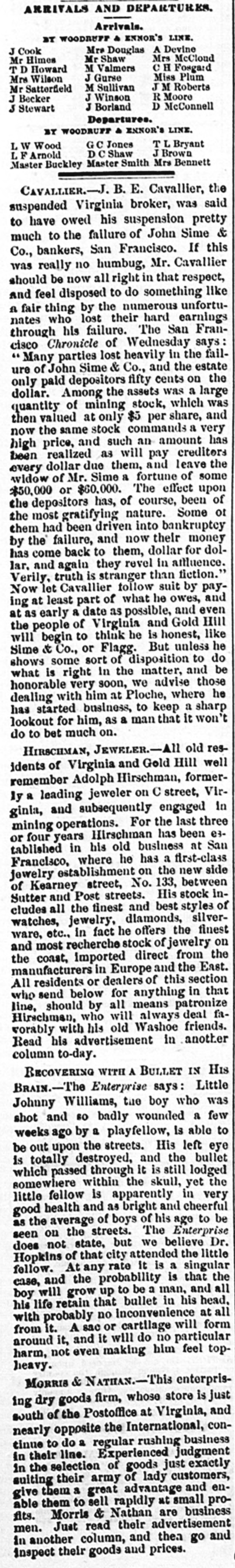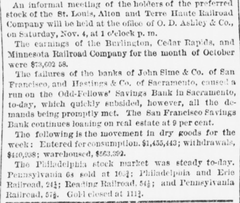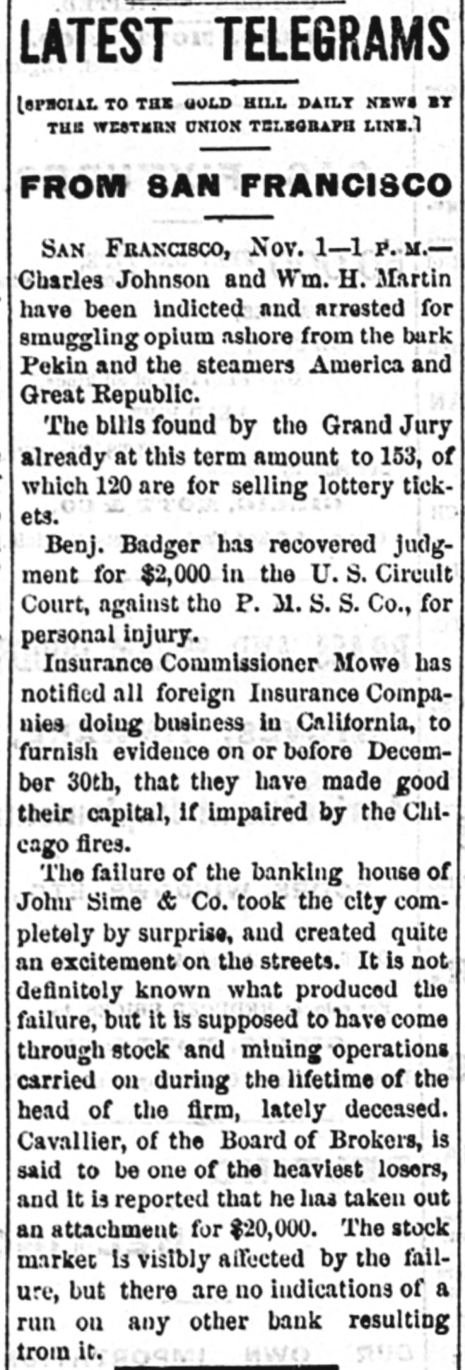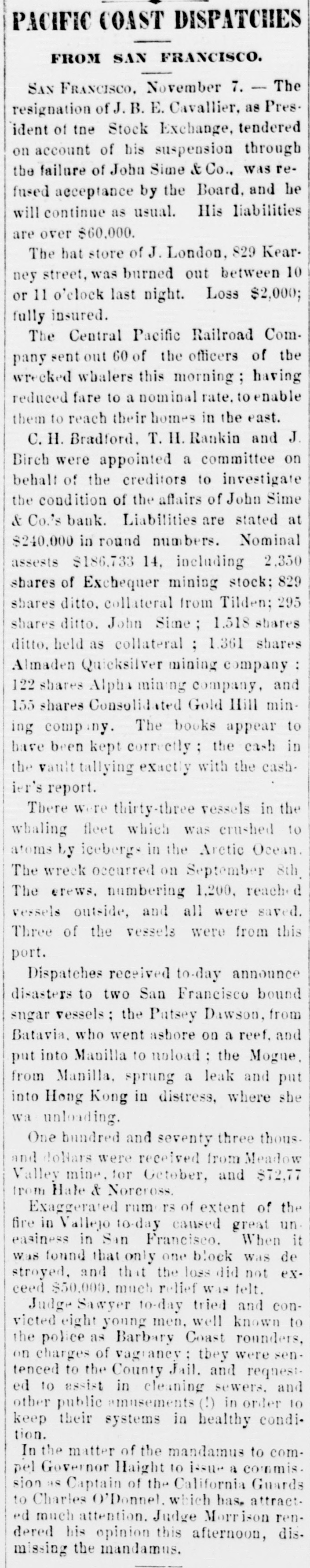 Telegraphic. Reported for the " New North-West, BY W.U. TELEGRAPH.CO.- A. WILLEY, OPERATOR. Tammany. New York, November 2d.-A statement is made, founded on the warrants paid by the Broadway Bank, that.Ingersoll and Garvey, An depositing, invariably gave 42 per cent. to Woodward, 24 per cent. to Tweed and kept 31 for themselves. Reduction of Debt. Washington. November ..The public debt has been reduced $8.950,490 during October. The coin balance is ninety-nine and half millions. " Is the Cancassian Played Out ?" Washington, November 1st -Gen. George B. Will liams, 2d deputy of the Internal Revenue Bureau, to day concluded an engagement with the Japanese Min later to go to Japan and organize an internal revenue system similar to that of the United States. The engagement is for three years, at large salary. Maj. Thos. Long, connected with the National In telligencer, died to-day. aged 75. Legal Proceedings. Chicago, November to- Palmer. on October 30th, wrote to Attorney-General Bushnell, now in this city, instructing him to take proper steps to have Lieutenant General Sheridan, Col. Frank T. Sherman. Maj. Colston and others, connected with the organiza tion of the regiment of Home Guards, a member of which shot Col. T. W. Grosvenor. a few days after the great fire, presented to the Grand Jury for indictment for their connection with that tragedy. It is said Mayor Mason will also be indicted. It is also reported that Attorney-General Bushnell and Prosecuting At torney Reed were in consultation to-day is reference to the matter. One man was killed and another probably fatally in jured to-day, by falling wall of the Tribune building The men were engaged in tearing down the wall. Utah. Salt Lake, N ovember 1et.-To-day everything is pacific, and there is not the least probability in this city of any outbreak or difficulty. The Mormons alkdis claim the most remote Intention of resieting the law or opposing the U S. officers in the performance of their duties. Judge McKean's course in admitting Mayor Wells to bail is admitted in all quarters to be eminently wise and proper. No fault is found for 10 fusing ball for Stont and Kimball, although its not deemed that the probability of their guilt is greater than Wells. It is understood that Marshal Patrick is organizing an expedition to follow and arrest Brigham Young. Reliable reports are to the effect that Young is etill moving Southward, having 11 wagons and 100 armed men, mounted. The appointment of Mr. Geo. c. Bater, as U. 8. Prosecuting Attorney for Utah is approved by both Mormon and Gentile papers. Business is dull, and money unusually scarce. The weather is delightful New York. At meeting of the Board of Supervisors to-day. Mavor Hall suhmitted resolution, which was adopted, dividing the city into fifteen election districts, and designating certain Tammany officials to receive the election retarns. This is thought to be in the interest of Tammany No account yet of the missing Ingersoll. The non-arrival of the Grand Duke Alexia keeps the reception committee in ferment. It the Duke arriv ves this week themilitary reception which it was proposed to have will be deferred, as the law prohibits any mil itary parades in the city for fire days preceding the election The Civil Service. Weshington, November -The President has appointed Chas. c. Beaman. jr., to examine claims in the Department of State. I The Clvil Service Commission was in session to day on the subject of Postmasters. The difficulty is to fix point where competitive examinations shall com mence, as of 30,000 postmasters, 22,000 receive sal ] aries less than $100 n year. It is thought this clas should not submit to examinations, as the greate port of the offices are held mere, for neighboorhood e Washington. 8.-Information has been receive that 200 Ku Klux bave made voluntary confession e and surrendered to the authorities. They are dis r gusted with the K. K. thirty-seven of them have confessed at this writing. It is estimated three hun dred have fled. One hundred and two are confined in jail Yorkville, The priconers speak well of thei treatment. al Pacific Coast. is San Francisco, November et.--The old bankin 5, house of John Sime & Co., failed this morning. Th supposed cause is unsuccessful stock operations. Sim 0 died ten daysago. The stock market is falling beavil No indications of the fallnre affecting other hanks P, San Francisco, November 9d-The failure of Jno e Sime & Co., bankers, of San Francisco, caused als is failure of Hastings & Co., of Sacramento. Edwd. Kehoe, a restaurant waiter was killed thi : evening by the accidental discharge of pistol, Andrew Wilson was killed, and Jno. Beckley fatall injured by fabling in the Belcher mine, Virginia city . yesterday e San Francisco, -The failure of the bank of Sim it & Co., Sacramento cansed a run on the Odd Fellow in Savings Bank of Sacramento. which quickly subsided All demands promptly met. a Lawrence Taff, hostler. was killed fn Virginia Cit yesterday by kick of horse. a Christate Johnson Dase, was shot dend by Ben e. Reed,a werthlees bummer, at Nevada city yesterday Reed was arrested. Niscellaneons. Ottawa, Out. November -Skead's lumber mi burned this morning Loss. $40,000. New York, November ist.-4 special dispatch from Washington evening, says it is asserted on authority of Senator Poole that General Grant has pressed out determination to declare martial law through the entire South in consequence of the continue w ontrages. The Board of Health to-day declared Charleston ok fever. Key West infected ports, on account of the yello as Baltimore, November mass meeting of tl a Democratic Conservative party of this city was to-night in Monument Square to protest he proceedings in South Carolina under the against t al of the writ of corpas. Reverdy Johnson suspension sided. Several were adopted and p at delivered by Mr. Johnson, Pinkney White, address Josh Van Zandt, Mayor Cleet, and others. th TELEGRANS IN BRIEF be 2000 The Chica
