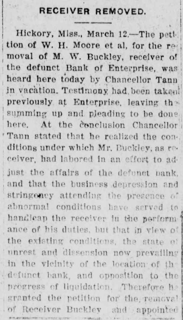 RECEIVER REMOVED. Hickory, Miss., March 12.-The pett tion of W. H. Moore et al, for the re moval of M. W. Buckley, receiver of the defunct Bank of Enterprise, was heard here today by Chancellor Tann in vacation. Testimony had, been takent previously at Enterprise, leaving th summing up and pleading to be done here. At the conclusion Chancellor Tann stated that he realized the conditions under which Mr. Buckley, as re. ceiver, had labored in an effort to ad. just the affairs of the defunet bank, and that the business depression and stringency attending the presence of abnormal conditions have served to handicap the receiver in the perform ance of his duties, but that in view of the existing conditions, the state of unrest and dissension now prevailing in the vicinity of the location of th defunct bank, and opposition to the progress of liquidation. Therefore It granted the petition for the removal of Receiver Buckley and appointed