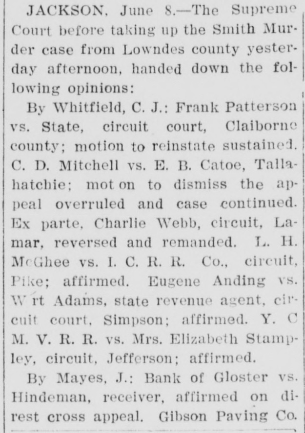 JACKSON, June 8.-The Supreme Court before taking up the Smith Murder case from Lowndes county yesterday afternoon, handed down the following opinions: By Whitfield, C. J.: Frank Patterson vs. State, circuit court, Claiborne county; motion to reinstate sustained. C. D. Mitchell vs. E. B. Catoe, Tallahatchie; mot on to dismiss the appeal overruled and case continued. Ex parte, Charlie Webb, circuit, Lamar, reversed and remanded. L. H. McGhee vs. I. C. R. R. Co., circuit, Pike; affirmed. Eugene Anding vs. W rt Adams, state revenue agent, circuit court, Simpson; affirmed. Y. C M. V. R. R. vs. Mrs. Elizabeth Stampley, circuit, Jefferson; affirmed. By Mayes, J.: Bank of Gloster vs. Hindeman, receiver, affirmed on direst cross appeal. Gibson Paving Co.