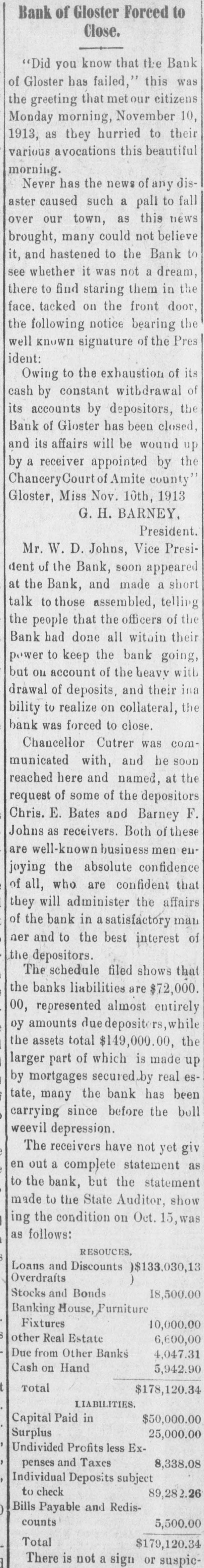ings, SO no dividends were declared, all the earnings being passed to the surplus fund to enlarge the working capital of the bank. In 1898 the then Bank of Gloster retired from basiness, the Commercial Bank soon there after, amended its charter and changed its name to the Bank of Gloster. After a few years the earnings of the bank had increas ed the surplus fund to amount which enabled the bank to double its capital stock making it $50,000, this gave it greater prestige in banking circles and for years it was regarded as one of the strongest country banks of the state, making handsome profits, whish all passed to the surplus funds to increase the working capital. When the boll weevil came the bank had out large loans, many of which proved bad investments, the bank lossing heavy tnereby, this with the general depression hurt the bank but with all this, it is believed they could have safely pulled through had it not been for many failures of other banks in near by sections, which gave the depositors a feeling of unrest caus ing them to constantly withdraw their deposits, until the amount on deposit was reduced from $147,000 to some $70,000 in less than twelve months. A big part of the bank's securities being on land, which as a basis of value at this time is very low, it was impossible to raise funds to meet the heavy withdrawals. At the close of business Friday the officers saw that the bank was doomed unless some unforseen aid came, and the Cashier was instructed to keep all deposits made Saturday separate that it may be returned should the failure come. After Saturday it was plain that a receiver would have to be asked for, although the assets did ex ceed the liabilities more than two to one. The failure of this bank is the most serious blow that has ever struck Gloster, besides the hardship on the depositors, it means the passing of an institution which has been of untold benefit to this section. No bank had a more accomodating and obliging set of officers than this bank, who were always ready and anxious to extend aid to any worthy applicant, and out of the mist of the failure no finger of scoin